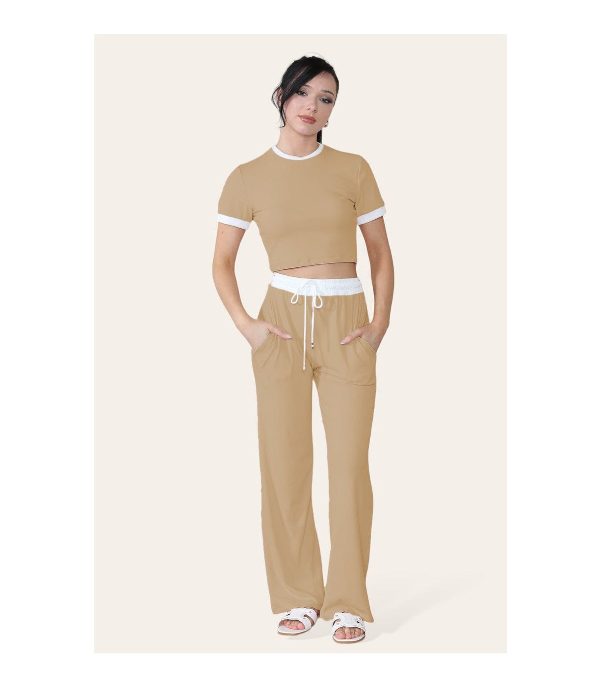 Ribbed Contrast Wide Leg Flared Trousers And Top Loungewear TRS Cropped Set