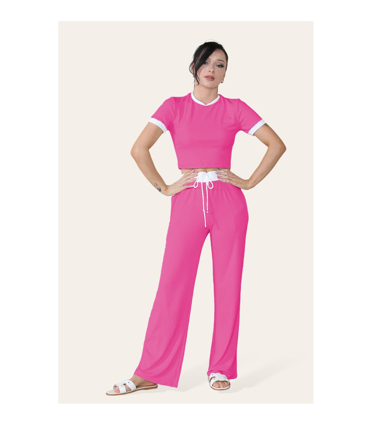 Ribbed Contrast Wide Leg Flared Trousers And Top Loungewear TRS Cropped Set