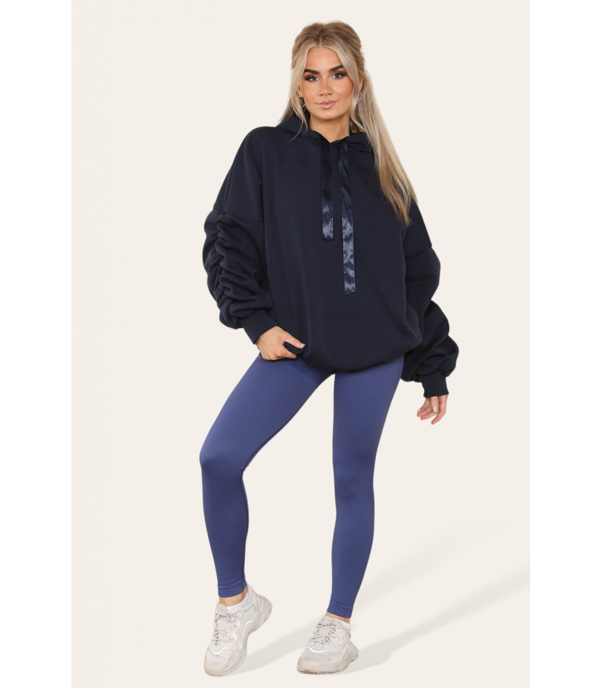 Oversized Ruched Sleeves Hoodie With Satin Ribbon with High Waist High Rise Seamless Ribbed Legging Set