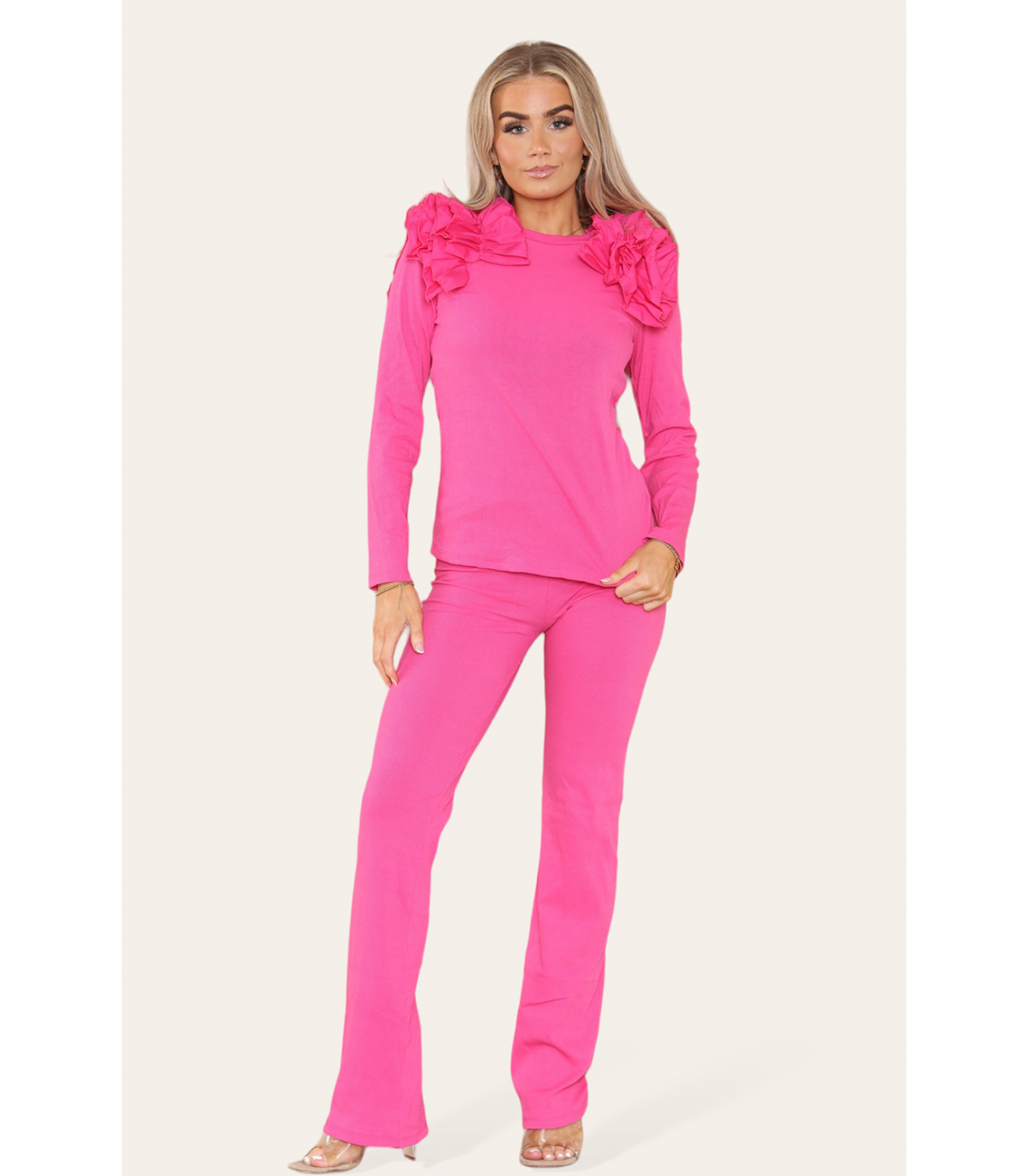 Ruffle Frill Shoulder Ribbed Loungewear CoOrd Top & Trouser Set