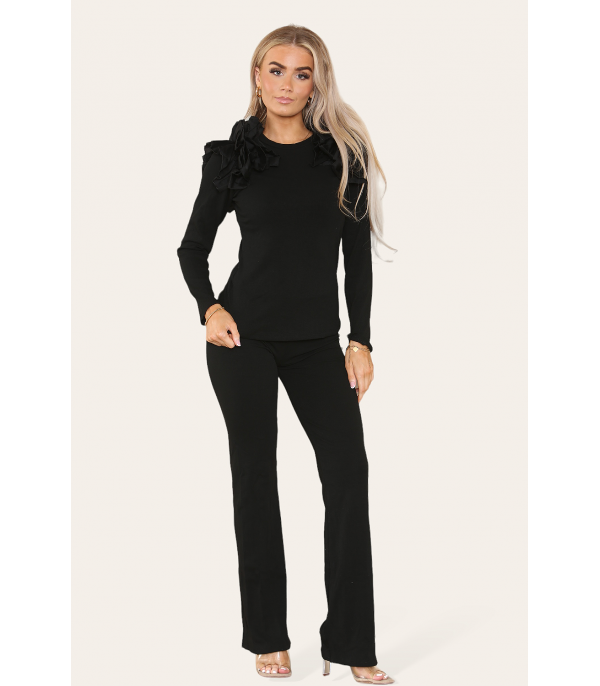 Ruffle Frill Shoulder Ribbed Loungewear CoOrd Top & Trouser Set