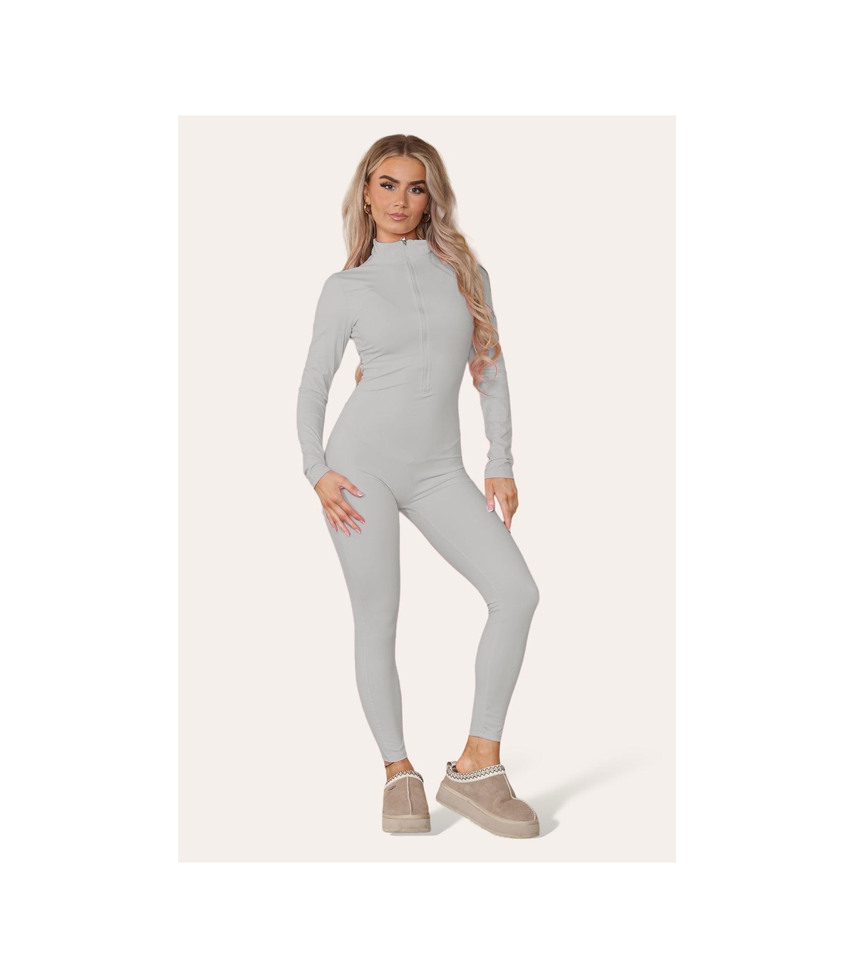 Ribbed High Neck Zipper Collar Jumpsuit Front Unitard Set