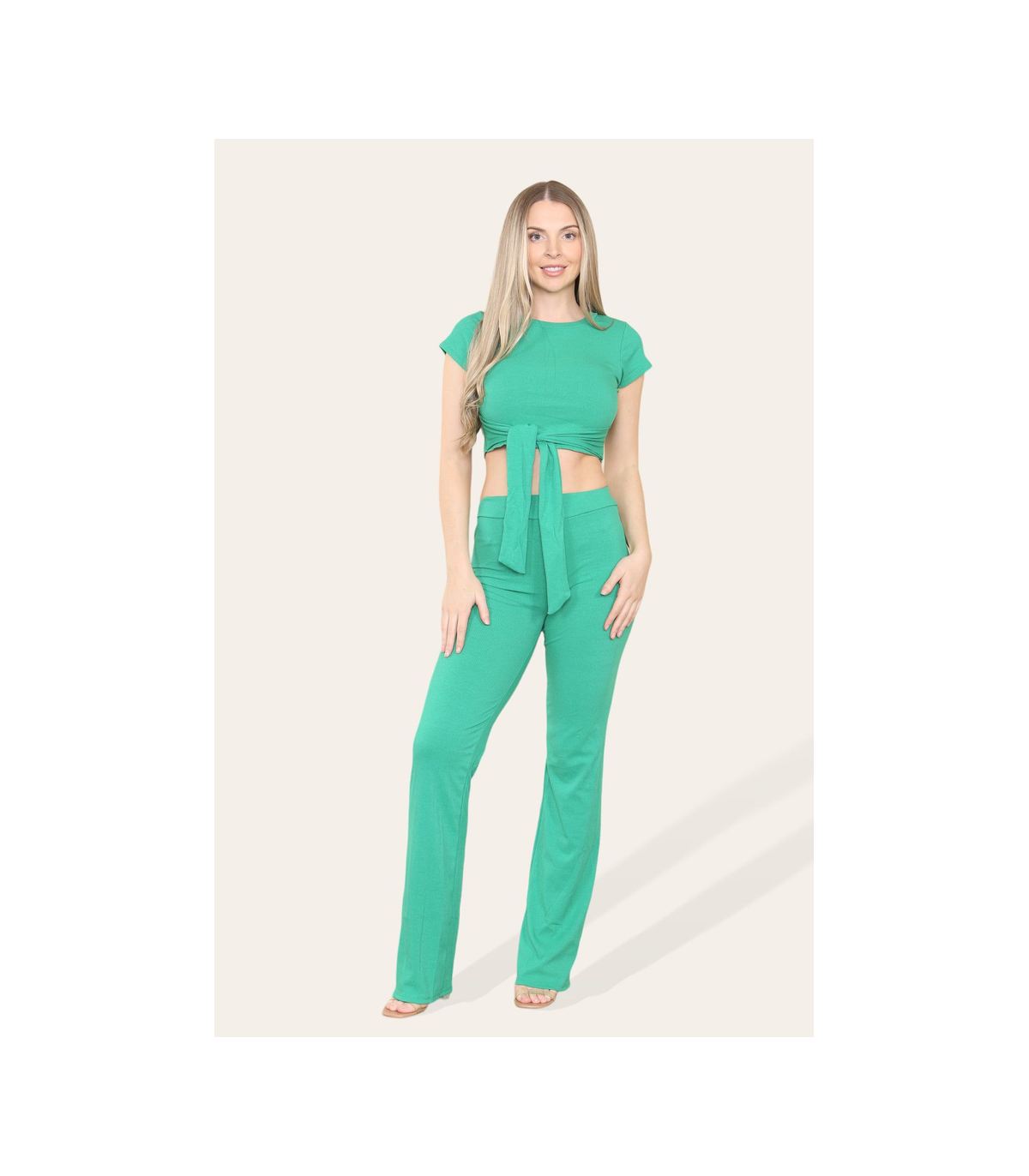 Tie Belt Front Cropped Loungewear Ribbed Trousers Set