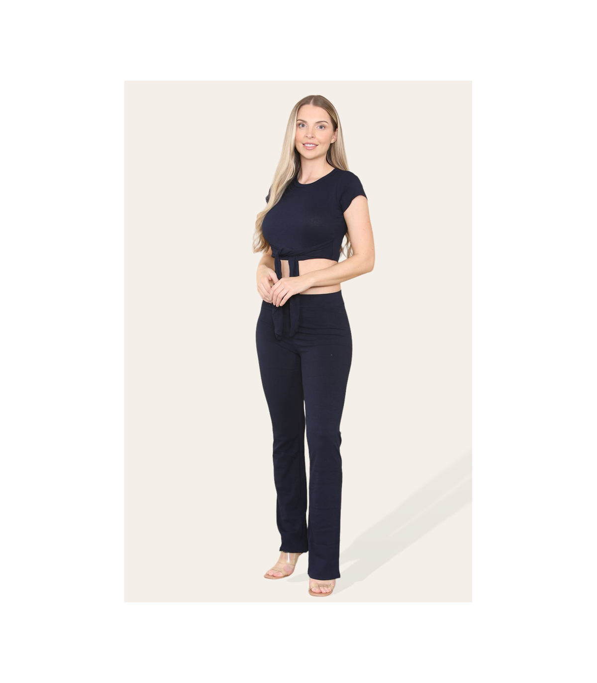 Tie Belt Front Cropped Loungewear Ribbed Trousers Set