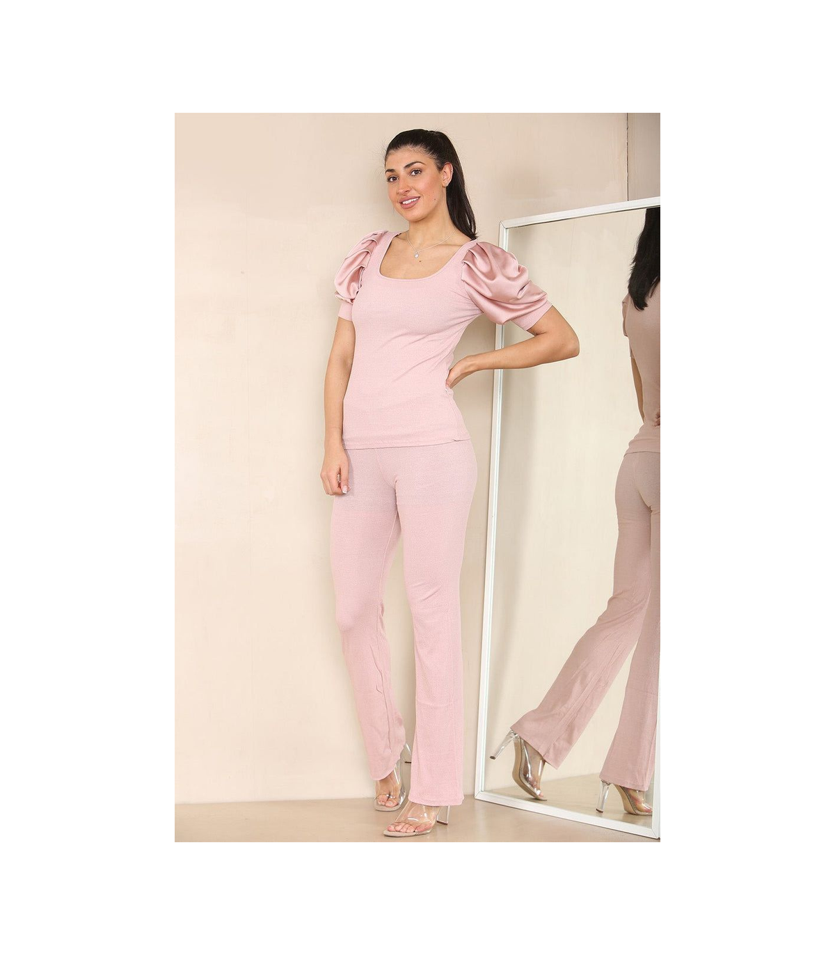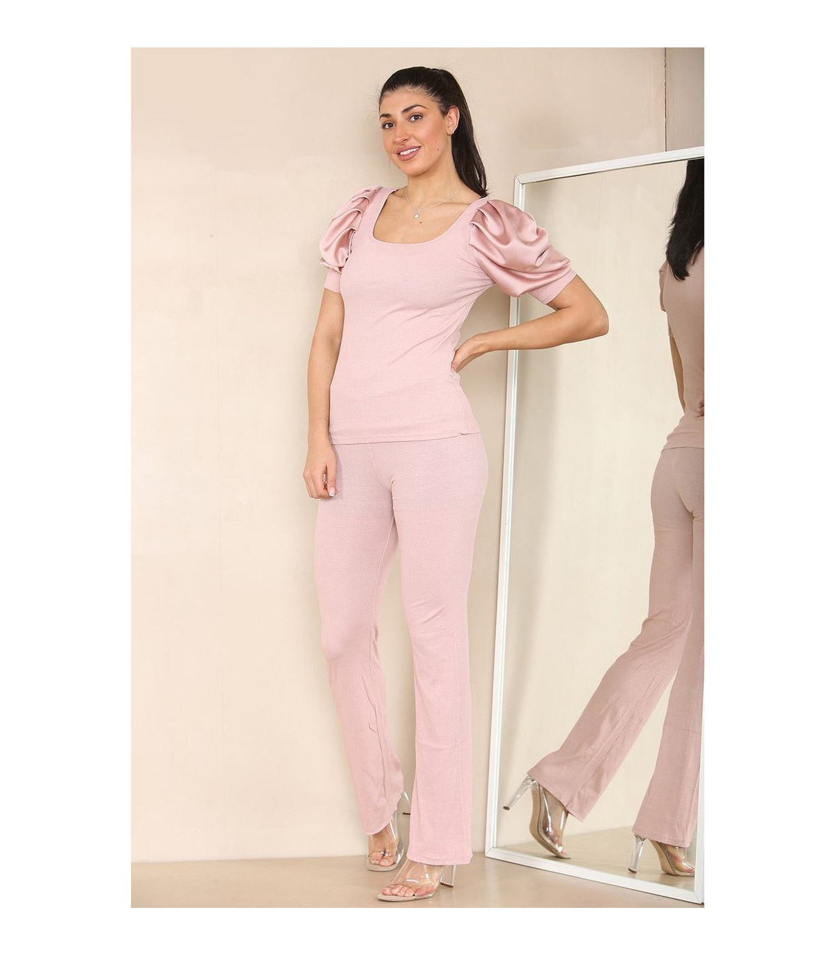 Silky Satin Puff Sleeves Ribbed Lounge Set