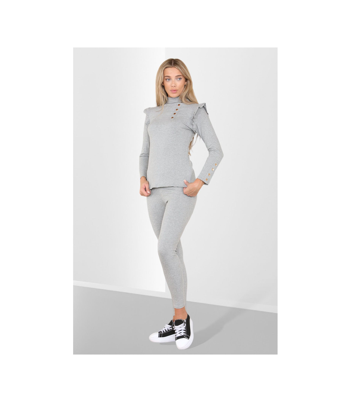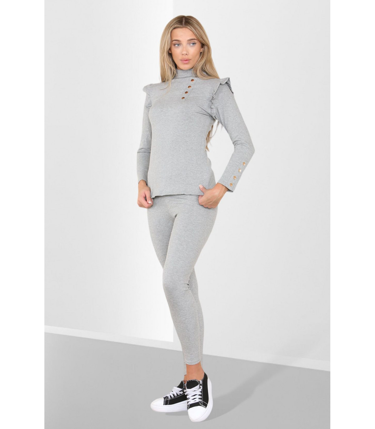 Side Buttons Frill Shoulder Side Neck Gold Button Detail Two Piece Loungewear Set