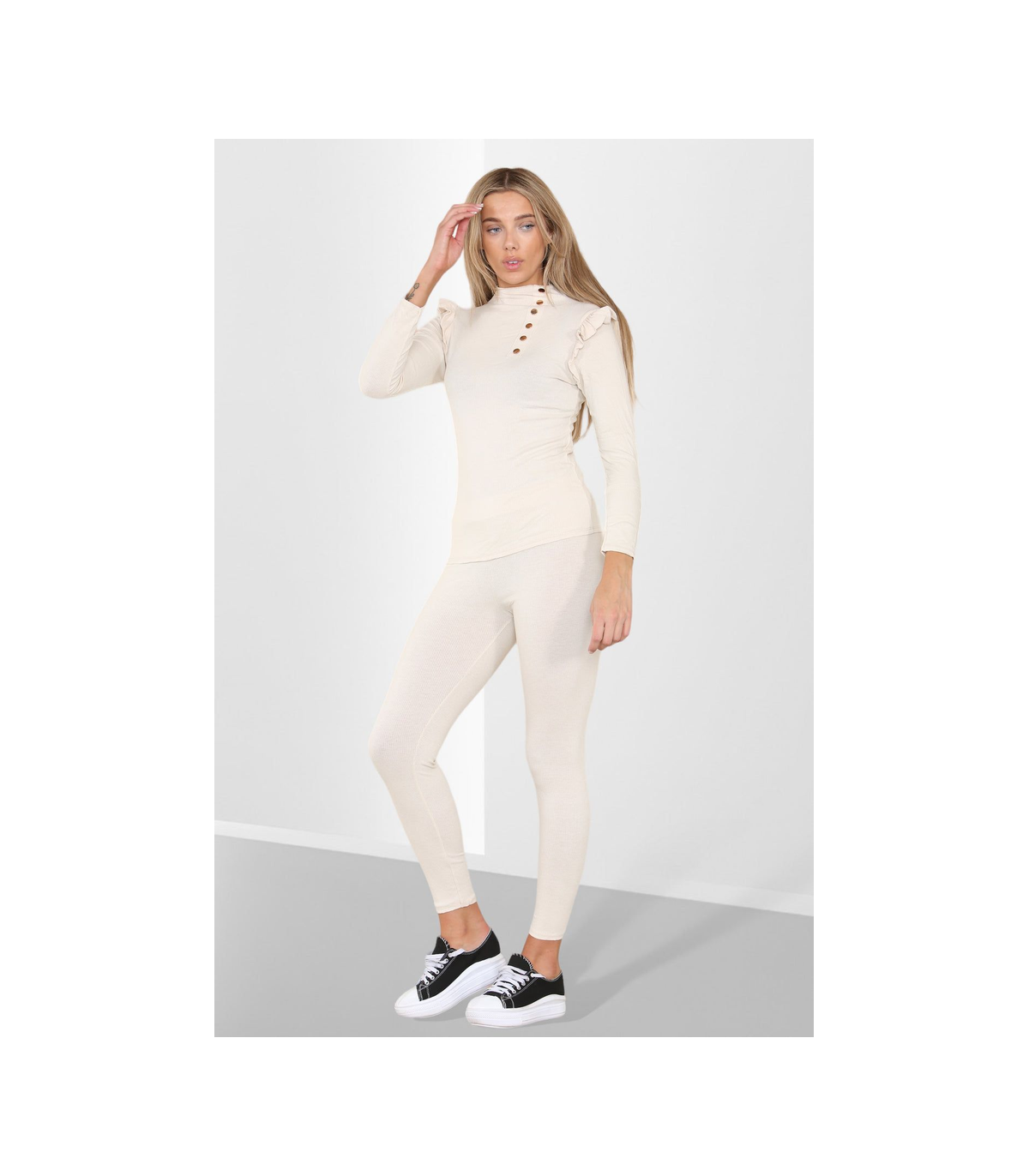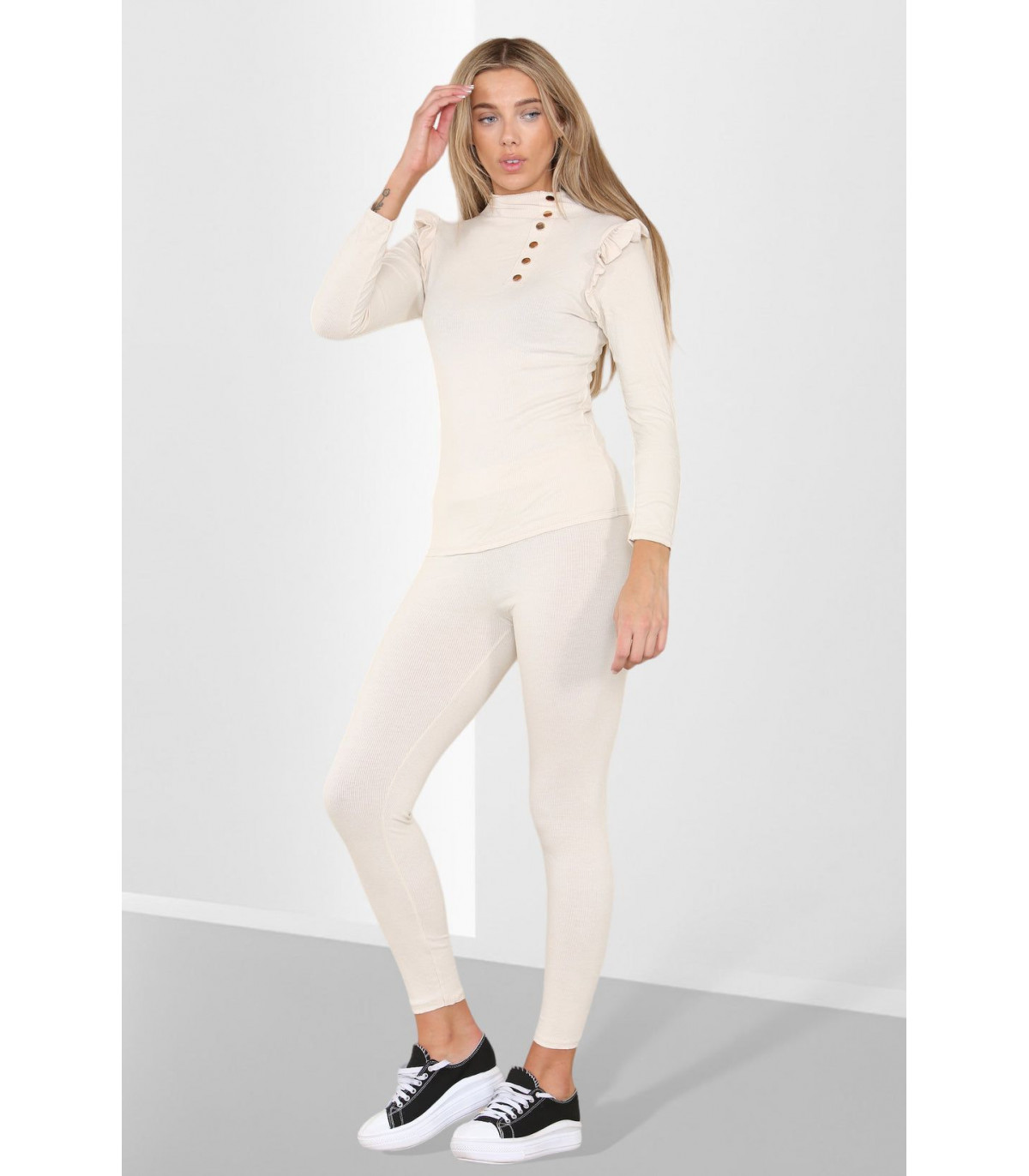 Side Buttons Frill Shoulder Side Neck Gold Button Detail Two Piece Loungewear Set