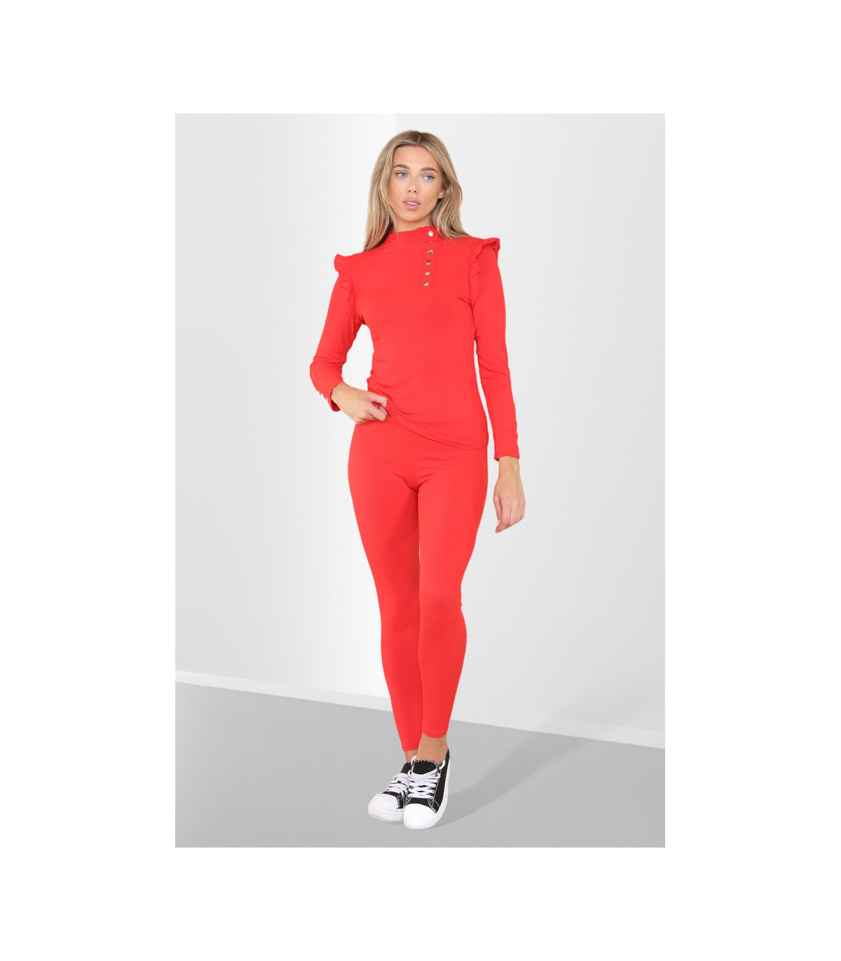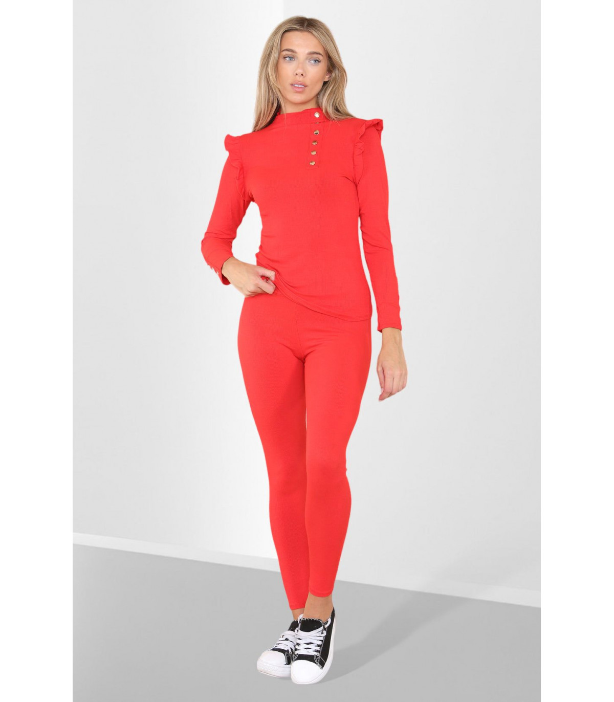 Side Buttons Frill Shoulder Side Neck Gold Button Detail Two Piece Loungewear Set