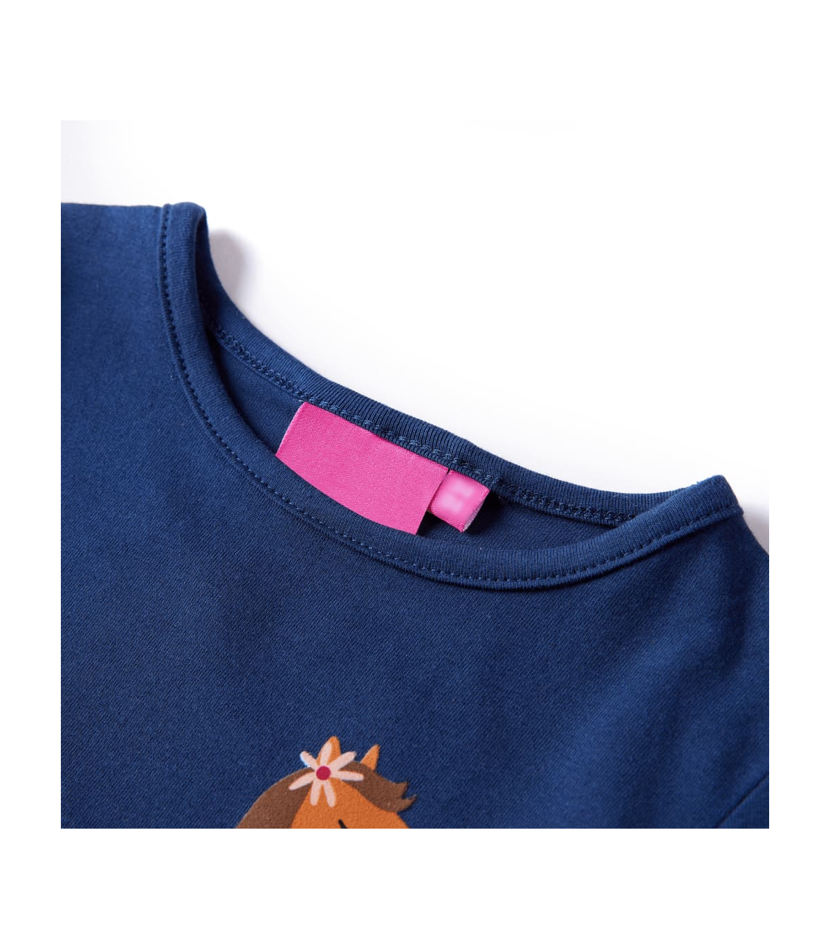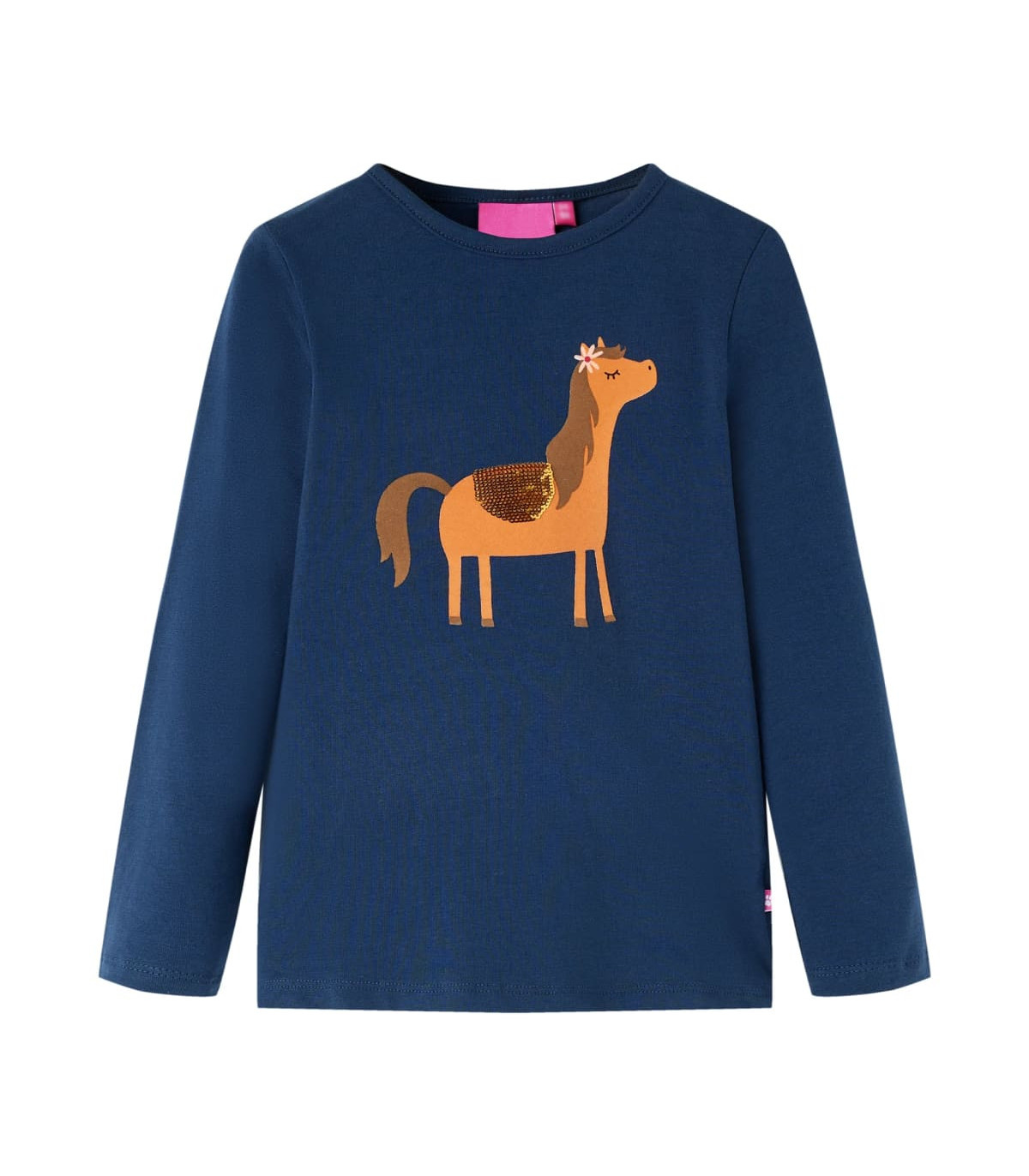 Our children's clothing line is all about affordable, high-quality, and durable everyday wear for kids aged 1,5 to 10. Our range includes jackets, sweaters, shirts, and many more, with a variety in style, size, and colour. Following the high-quality standard in the market, we are using high-grade materials and advanced manufacturing techniques. This kids' t-shirt has long sleeves, a round neckline, and a straight model. This navy blue t-shirt features a lovely pony. The children's long sleeve t-shirt is made from soft material with 95% cotton and 5% elastane for extra comfort and breathability. Good to know: The size chart in the picture provides measurements for kids aged 1,5 to 10, covering the height, chest, waist, and hip. You can easily find the right fit for your child.