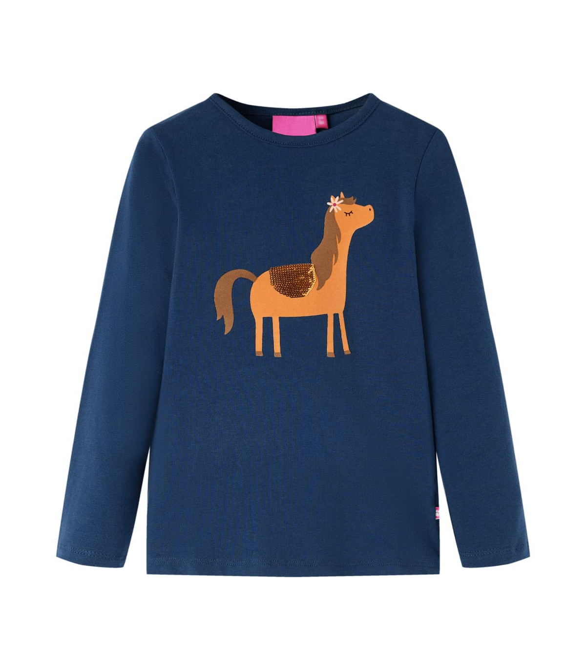Our children's clothing line is all about affordable, high-quality, and durable everyday wear for kids aged 1,5 to 10. Our range includes jackets, sweaters, shirts, and many more, with a variety in style, size, and colour. Following the high-quality standard in the market, we are using high-grade materials and advanced manufacturing techniques. This kids' t-shirt has long sleeves, a round neckline, and a straight model. This navy blue t-shirt features a lovely pony. The children's long sleeve t-shirt is made from soft material with 95% cotton and 5% elastane for extra comfort and breathability. Good to know: The size chart in the picture provides measurements for kids aged 1,5 to 10, covering the height, chest, waist, and hip. You can easily find the right fit for your child.