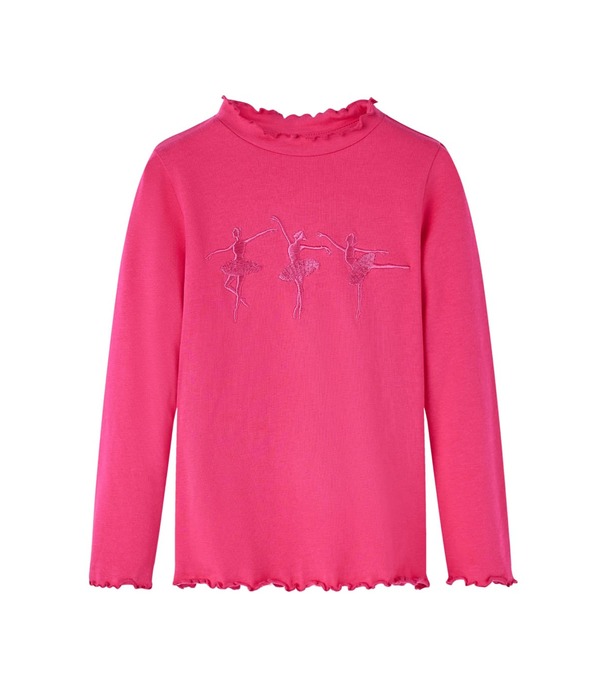 Our children's clothing line is all about affordable, high-quality, and durable everyday wear for kids aged 1,5 to 10. Our range includes jackets, sweaters, shirts, and many more, with a variety in style, size, and colour. Following the high-quality standard in the market, we are using high-grade materials and advanced manufacturing techniques. This kids' t-shirt has long sleeves and a half turtleneck, overlocked edges at the neckline, sleeves, and hem. This bright pink t-shirt features lovely ballerina girls. The children's long sleeve t-shirt is made from soft material with 95% cotton and 5% elastane for extra comfort and breathability. Good to know: The size chart in the picture provides measurements for kids aged 1,5 to 10, covering the height, chest, waist, and hip. You can easily find the right fit for your child.