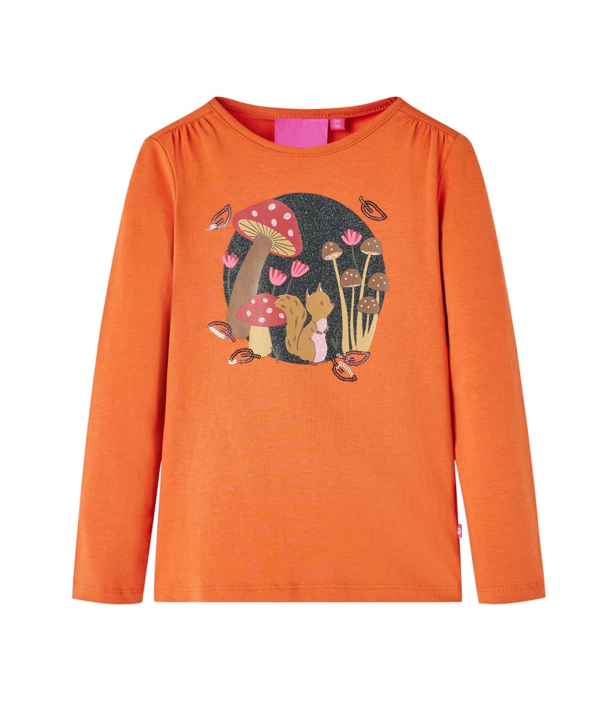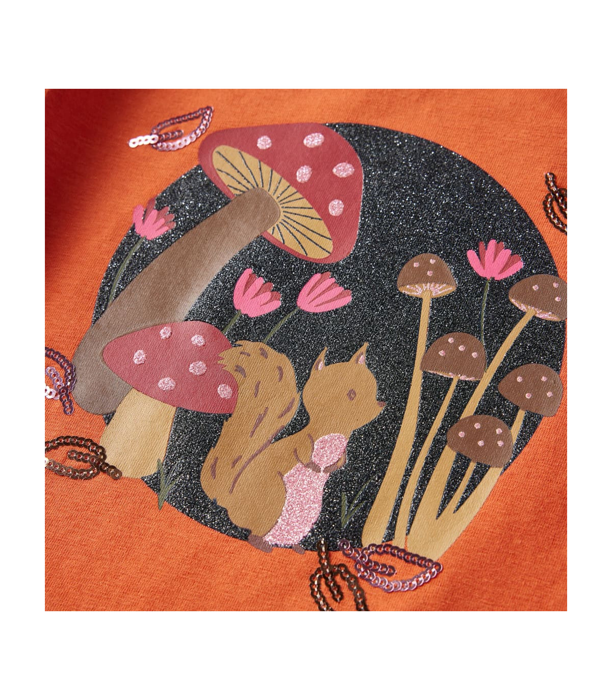 - Design: Squirrel, mushrooms, flowers, and sequin leaves