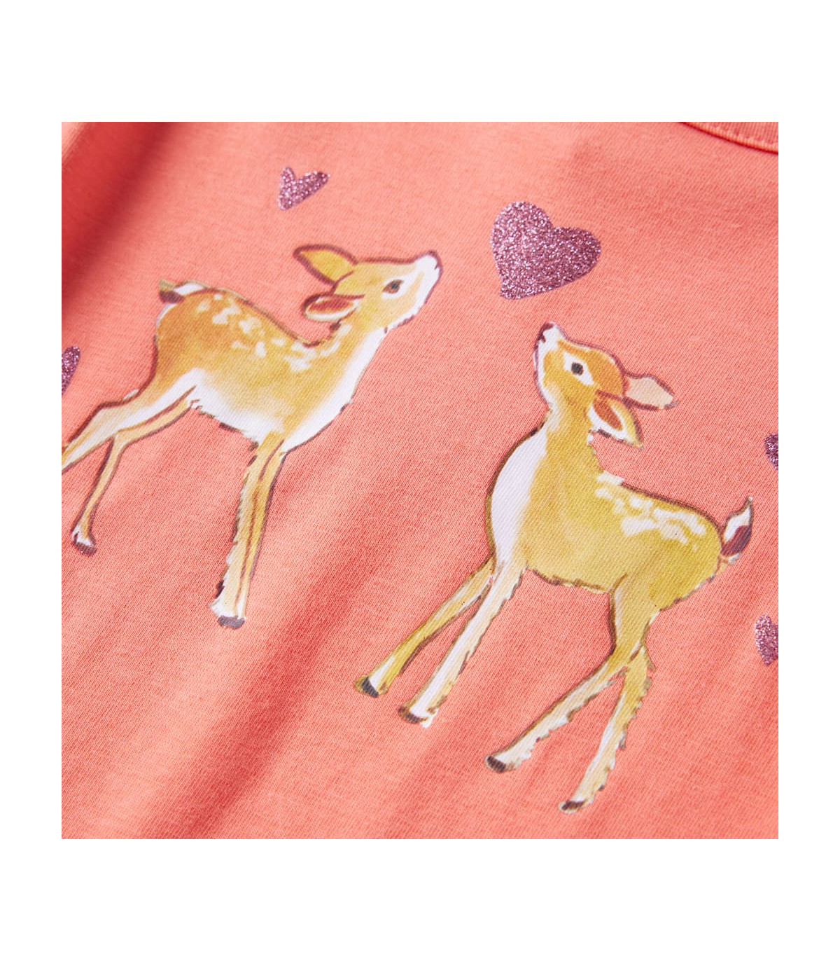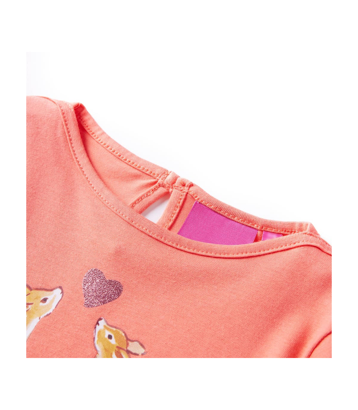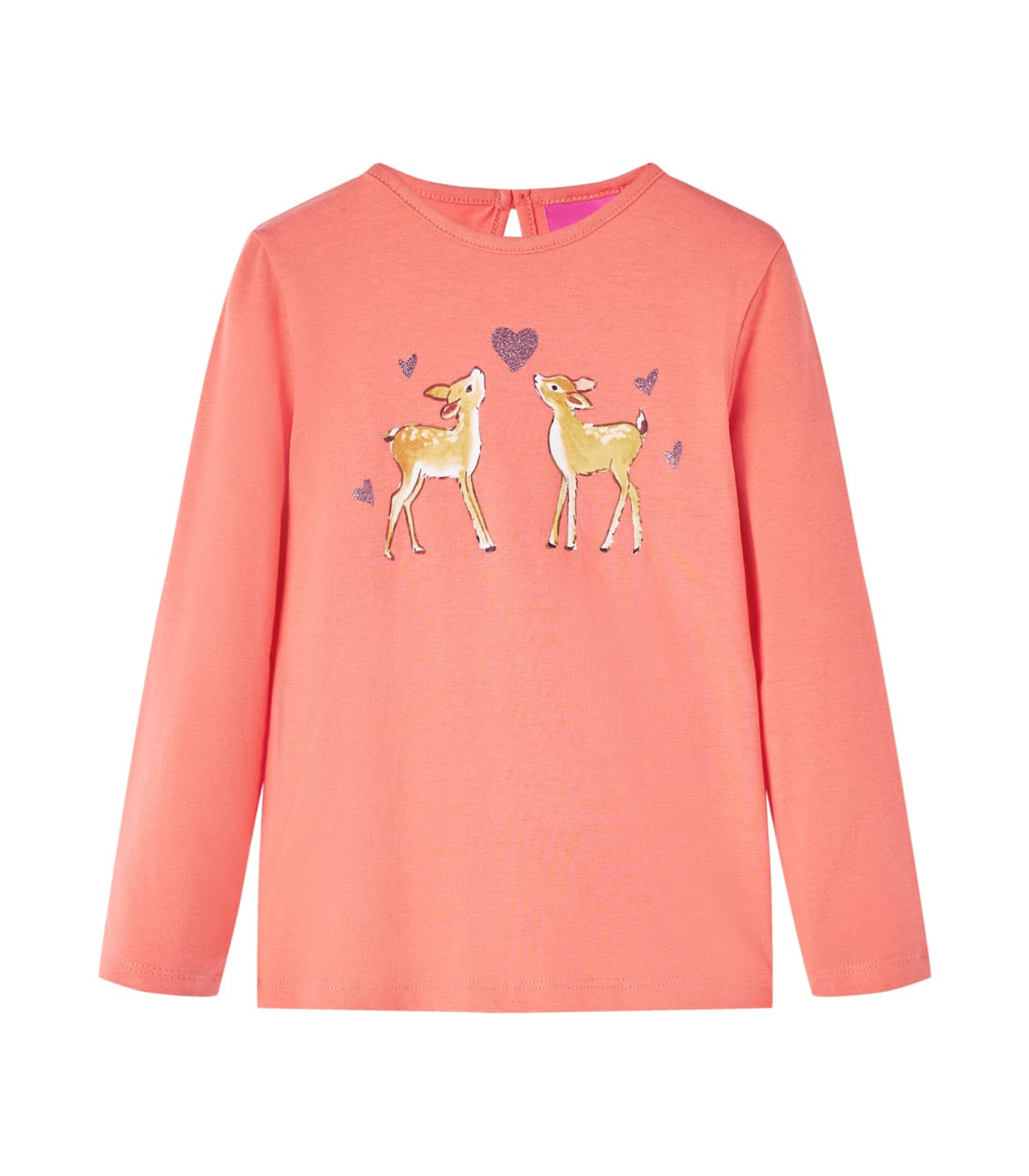 Our children's clothing line is all about affordable, high-quality, and durable everyday wear for kids aged 1.5 to 10. Our range includes jackets, sweaters, shirts, and many more, with a variety in style, size, and colour. Following the high-quality standard in the market, we are using high-grade materials and advanced manufacturing techniques. This kids' t-shirt has long sleeves, a round neckline, and a straight model. The children's t-shirt is printed with 2 deers, surrounded by heart patterns. The children's long sleeve t-shirt is made from soft material with 95% cotton and 5% elastane for extra comfort and breathability. Good to know: The size chart in the picture provides measurements for kids aged 1.5 to 10, covering the height, chest, waist, and hip. You can easily find the right fit for your child.