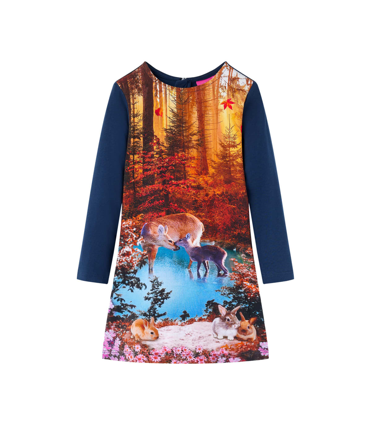 Our children's clothing line is all about affordable, high-quality, and durable everyday wear for kids aged 1.5 to 10. Our range includes jackets, sweaters, shirts, and many more, with a variety in style, size, and colour. Following the high-quality standard in the market, we are using high-grade materials and advanced manufacturing techniques. This kids' dress has long sleeves, a round neckline, and closes with a zipper at the back. This navy children's dress features a lovely deer print. The kids' short dress is made from soft material that includes cotton, and elastane for comfort and breathability. Good to know: This size chart in the picture provides measurements for kids aged 1.5 to 10, covering the height, chest, waist, and hip. You can easily find the right fit for your child.