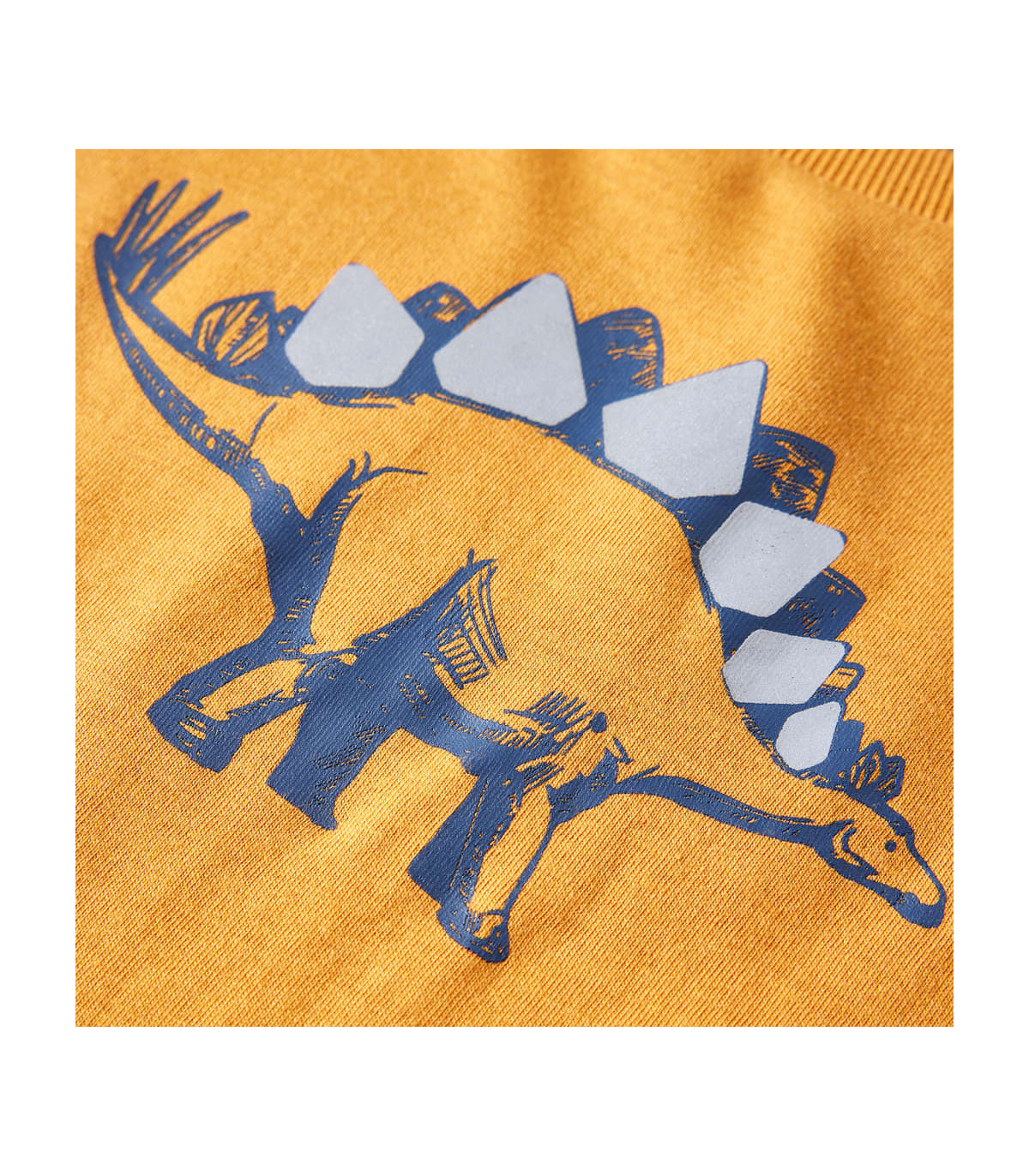 Our children's clothing line is all about affordable, high-quality, and durable everyday wear for kids aged 1.5 to 10. Our range includes jackets, sweaters, shirts, and many more, with a variety in style, size, and colour. Following the high-quality standard in the market, we are using high-grade materials and advanced manufacturing techniques. This kids' T-shirt has long sleeves, a round neckline, and a straight model. This dark ochre T-shirt features a dinosaur. The children's long sleeve T-shirt is made of 100% cotton that is treated with a silicon and enzyme wash for a soft and comfortable touch. Good to know: The size chart in the picture provides measurements for kids aged 1.5 to 10, covering the height, chest, waist, and hip. You can easily find the right fit for your child.