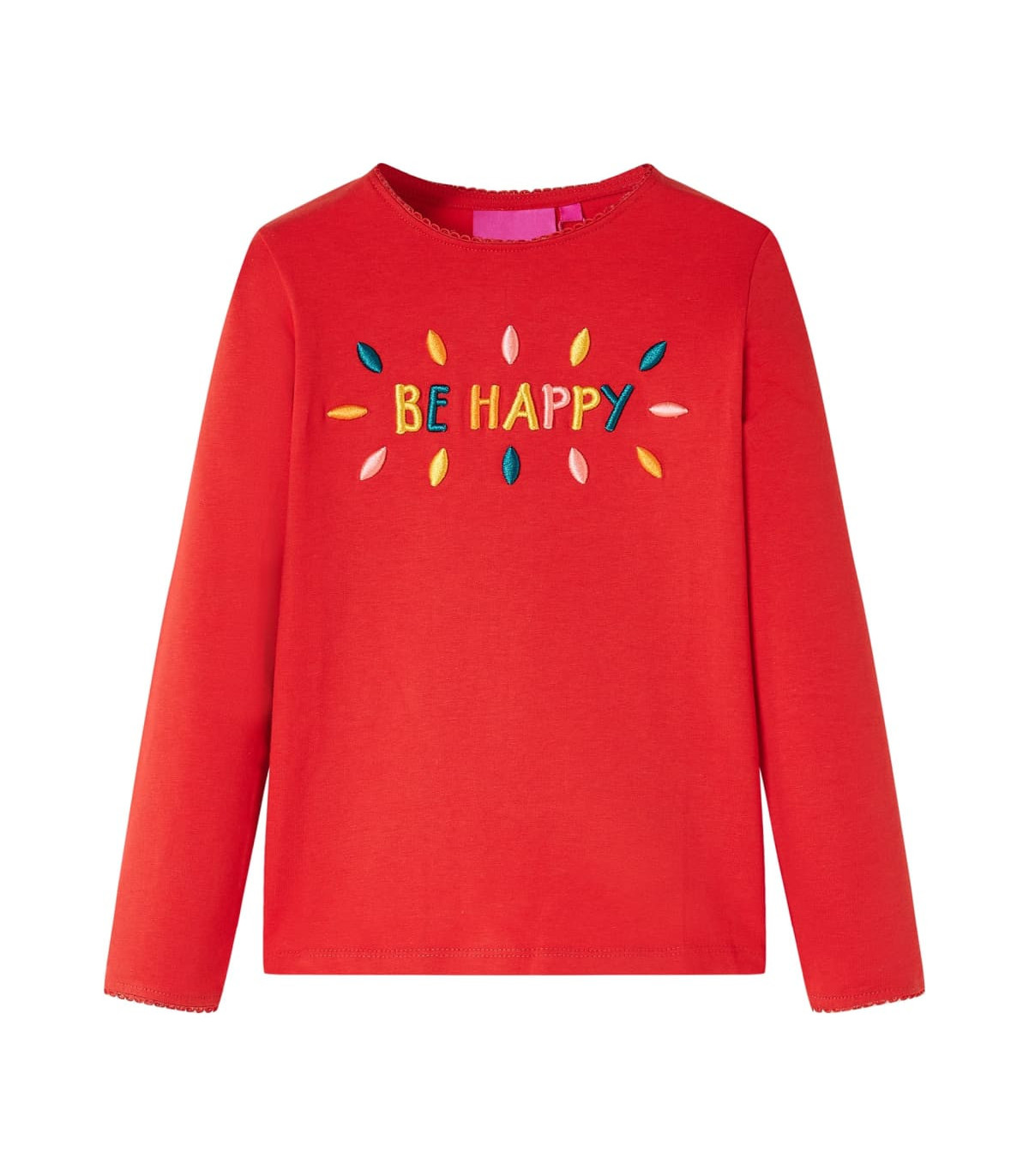 Our children's clothing line is all about affordable, high-quality, and durable everyday wear for kids aged 1.5 to 10. Our range includes jackets, sweaters, shirts, and many more, with a variety in style, size, and colour. Following the high-quality standard in the market, we are using high-grade materials and advanced manufacturing techniques. This kids' t-shirt has long sleeves, a round neckline, and a straight model. This red t-shirt features 3D colourful words. The children's long sleeve t-shirt is made from soft material with 95% cotton and 5% elastane for extra comfort and breathability. Good to know: This size chart in the picture provides measurements for kids aged 1.5 to 10, covering the height, chest, waist, and hip. You can easily find the right fit for your child.