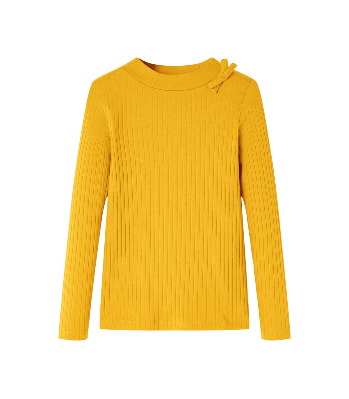 Our children's clothing line is all about affordable, high-quality, and durable everyday wear for kids aged 1.5 to 10. Our range includes jackets, sweaters, shirts, and many more, with a variety in style, size, and colour. Following the high-quality standard in the market, we are using high-grade materials and advanced manufacturing techniques. This kids' t-shirt has long sleeves, a round neckline, and a straight model. This cognac t-shirt features a bowknot decoration. The children's long sleeve t-shirt is made from soft material with 95% cotton and 5% elastane for extra comfort and breathability. Good to know: This size chart in the picture provides measurements for kids aged 1.5 to 10, covering the height, chest, waist, and hip. You can easily find the right fit for your child.