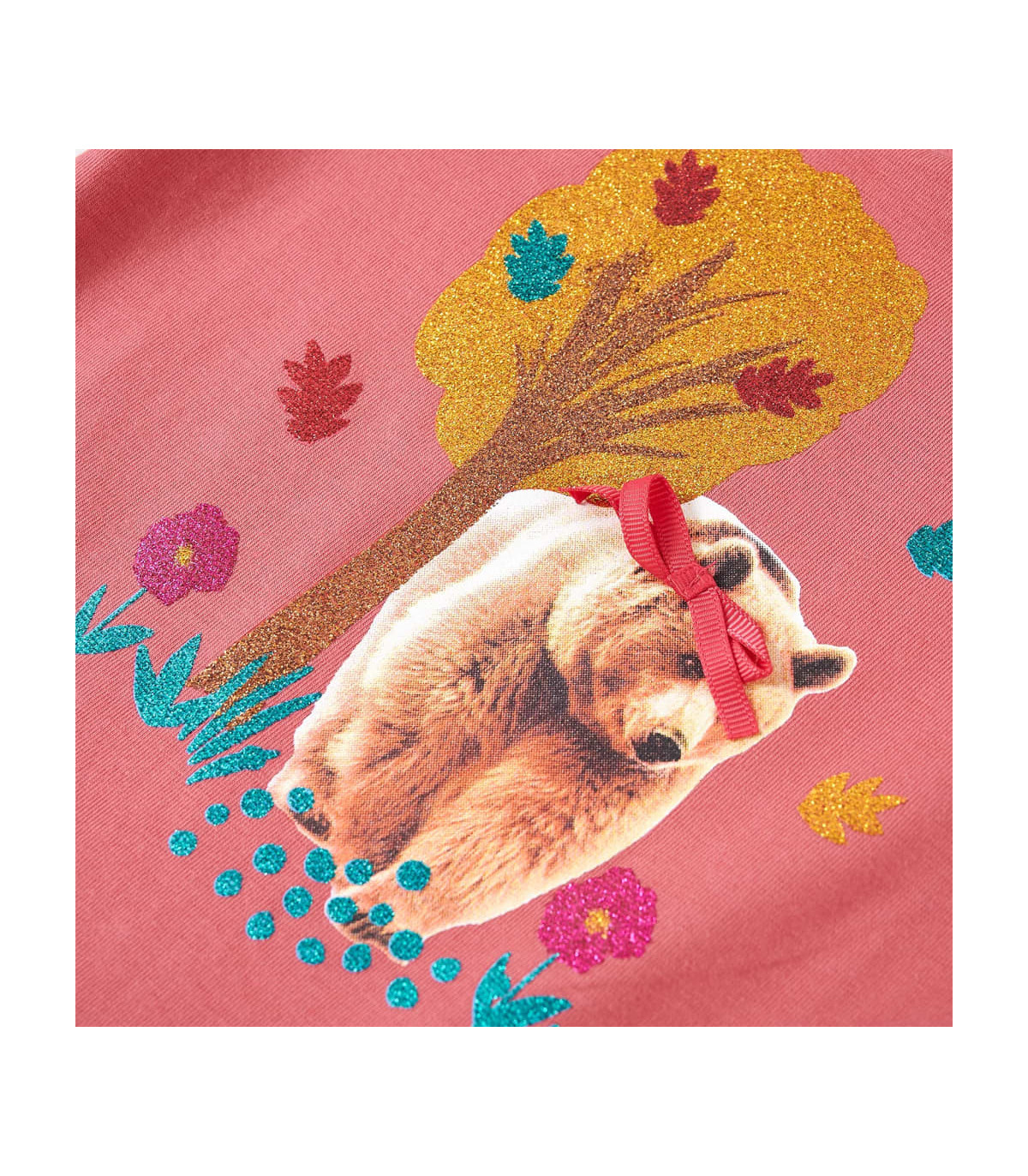 Our children's clothing line is all about affordable, high-quality, and durable everyday wear for kids aged 1.5 to 10. Our range includes jackets, sweaters, shirts, and many more, with a variety in style, size, and colour. Following the high-quality standard in the market, we are using high-grade materials and advanced manufacturing techniques. This kids' t-shirt has long sleeves, a round neckline, and a keyhole opening with a button at the back of the neck. This burnt orange t-shirt features a lovely bear and shiny tree print. The children's long sleeve t-shirt is made from soft material with 95% cotton and 5% elastane for extra comfort and breathability. Good to know: This size chart in the picture provides measurements for kids aged 1.5 to 10, covering the height, chest, waist, and hip. You can easily find the right fit for your child.