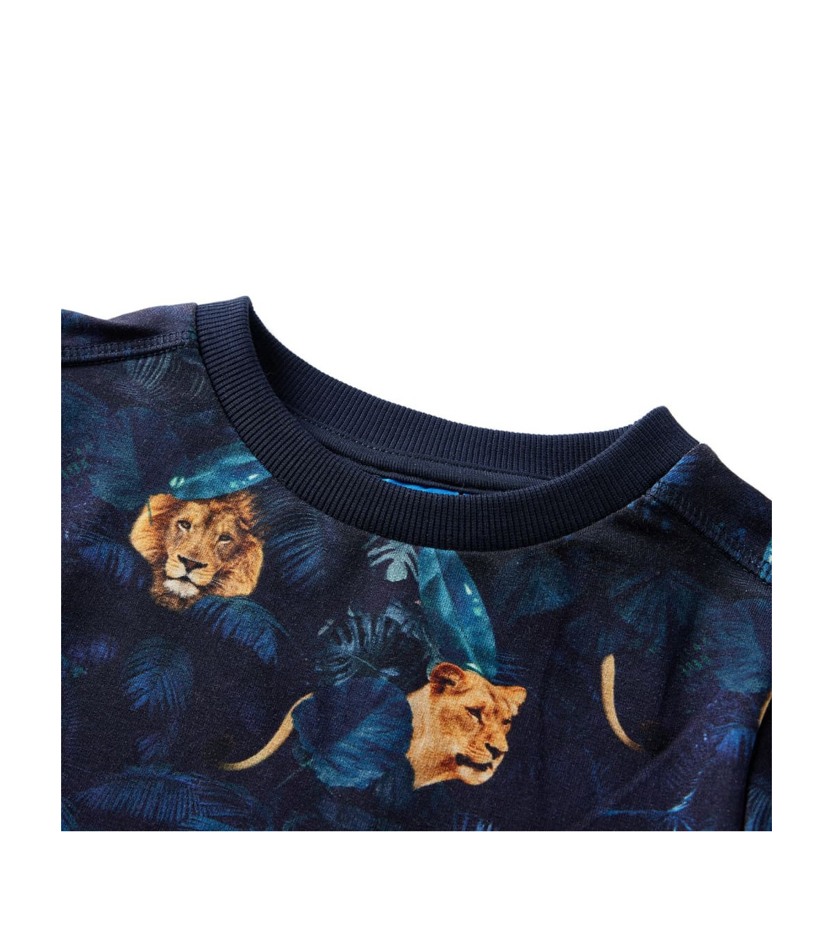 Our children's clothing line is all about affordable, high-quality, and durable everyday wear for kids aged 1.5 to 10. Our range includes jackets, sweaters, shirts, and many more, with a variety in style, size, and colour. Following the high-quality standard in the market, we are using high-grade materials and advanced manufacturing techniques. This kids' sweatshirt has long sleeves, a round neck, and rib-knit edges at the cuffs, neckline, and bottom. The children's sweatshirt features lion and plant prints all over. The kids' top is made of soft material that includes 95% cotton and 5% elastane for comfort and breathability. The soft baby terry lining provides extra warmth. Good to know: The size chart in the picture provides measurements for kids aged 1.5 to 10, covering the height, chest, waist, and hip. You can easily find the right fit for your child.