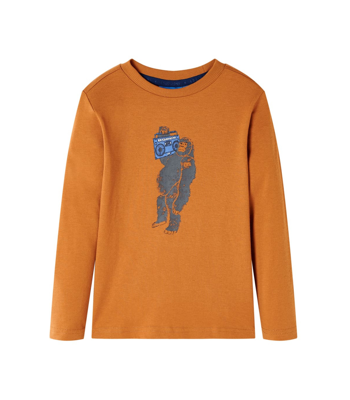 Our children's clothing line is all about affordable, high-quality, and durable everyday wear for kids aged 1.5 to 10. Our range includes jackets, sweaters, shirts, and many more, with a variety in style, size, and colour. Following the high-quality standard in the market, we are using high-grade materials and advanced manufacturing techniques. This kids' T-shirt has long sleeves, a round neckline, and a straight model. This dark ochre T-shirt features a big gorilla with a music player. The children's long sleeve T-shirt is made of 100% cotton for a soft and comfortable touch. Good to know: The size chart in the picture provides measurements for kids aged 1.5 to 10, covering the height, chest, waist, and hip. You can easily find the right fit for your child.