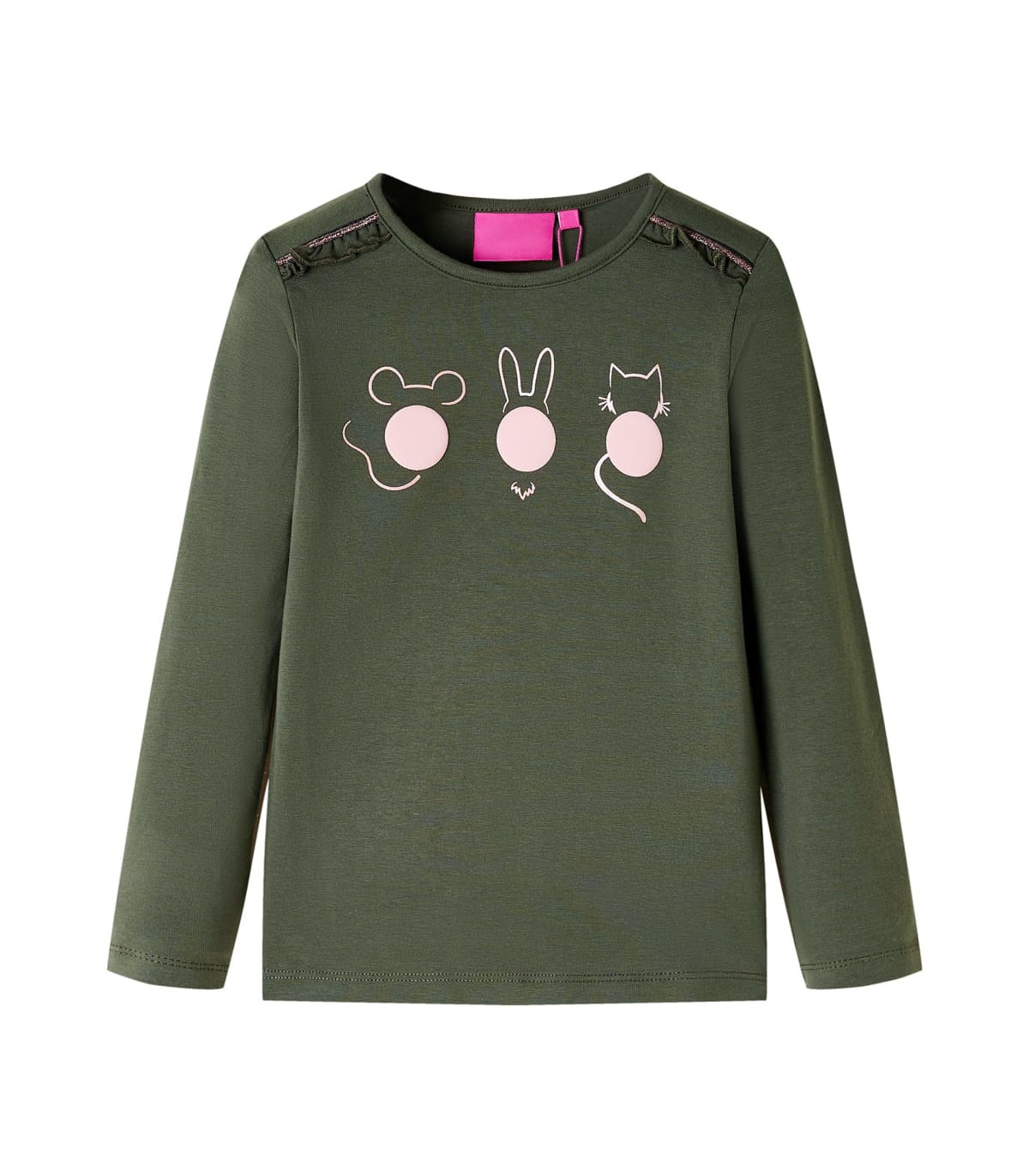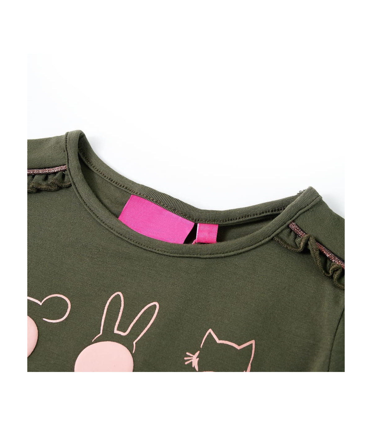 Our children's clothing line is all about affordable, high-quality, and durable everyday wear for kids aged 1.5 to 10. Our range includes jackets, sweaters, shirts, and many more, with a variety in style, size, and colour. Following the high-quality standard in the market, we are using high-grade materials and advanced manufacturing techniques. This kids' t-shirt has long sleeves, a round neckline, ruffles on the shoulder and a straight model. This navy t-shirt features a cute animals print. The children's long sleeve t-shirt is made from soft material with 95% cotton and 5% elastane for extra comfort and breathability. Good to know: This size chart in the picture provides measurements for kids aged 1.5 to 10, covering the height, chest, waist, and hip. You can easily find the right fit for your child.