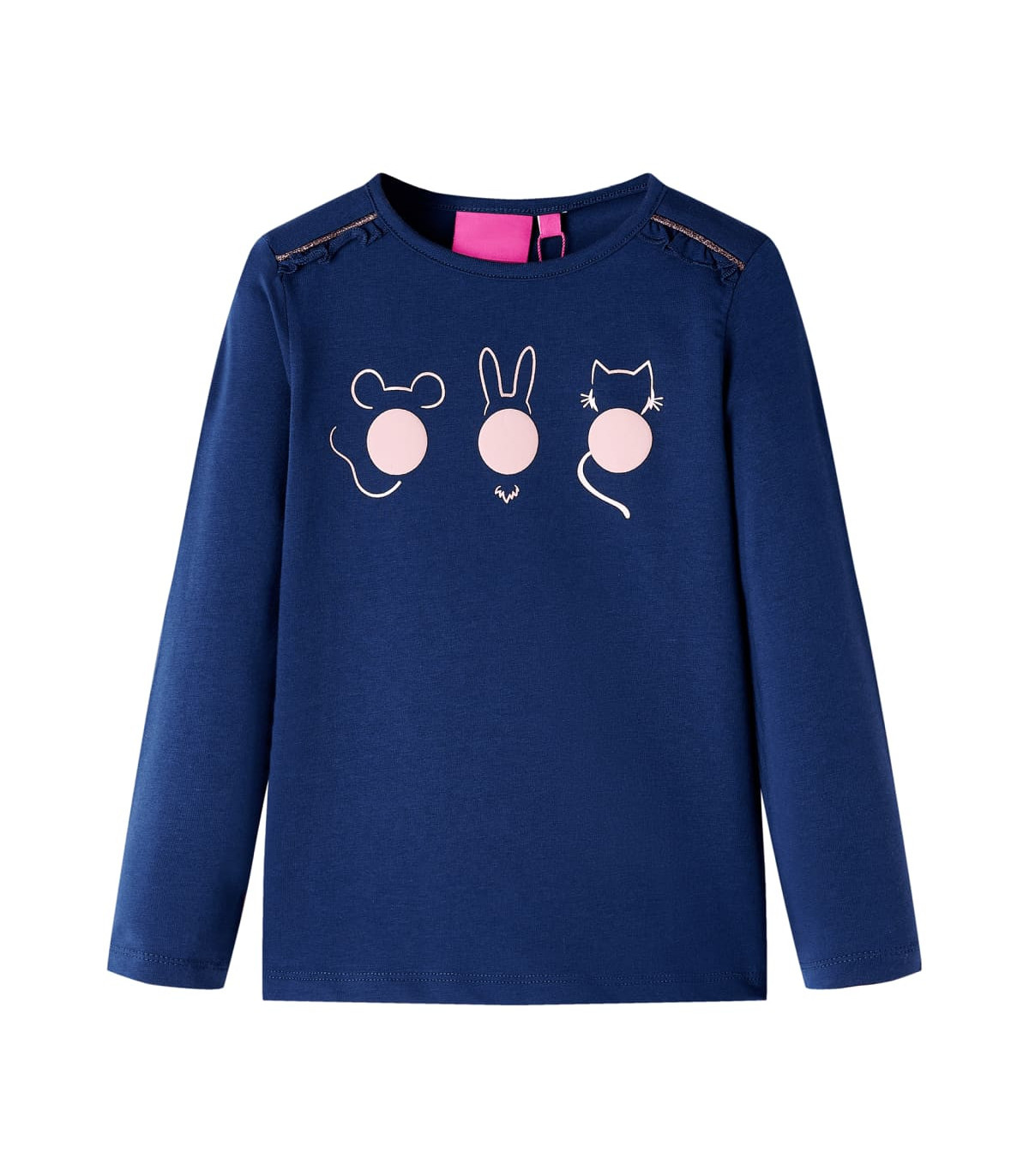 Our children's clothing line is all about affordable, high-quality, and durable everyday wear for kids aged 1.5 to 10. Our range includes jackets, sweaters, shirts, and many more, with a variety in style, size, and colour. Following the high-quality standard in the market, we are using high-grade materials and advanced manufacturing techniques. This kids' t-shirt has long sleeves, a round neckline, ruffles on the shoulder and a straight model. This navy t-shirt features a cute animals print. The children's long sleeve t-shirt is made from soft material with 95% cotton and 5% elastane for extra comfort and breathability. Good to know: This size chart in the picture provides measurements for kids aged 1.5 to 10, covering the height, chest, waist, and hip. You can easily find the right fit for your child.