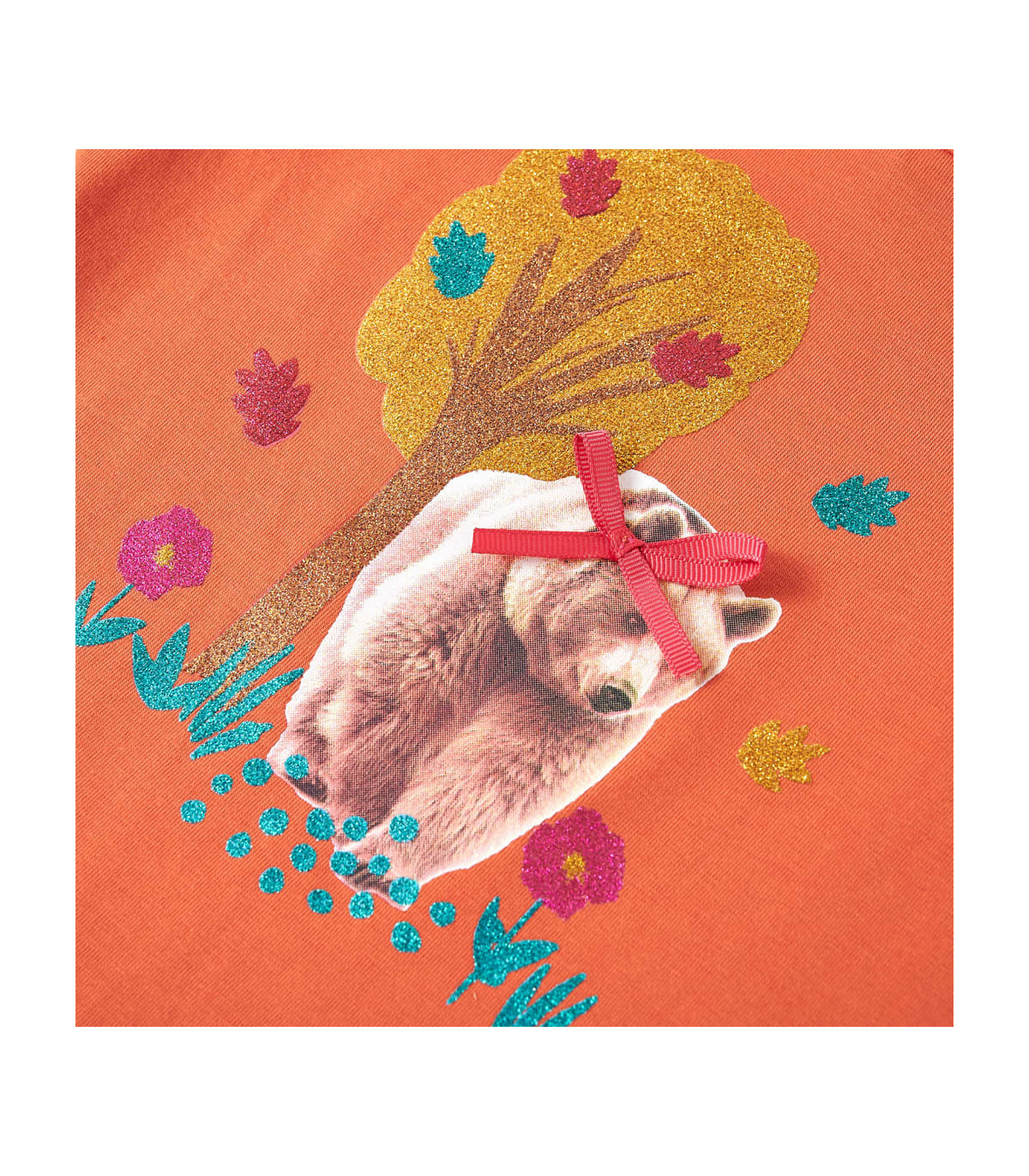 Our children's clothing line is all about affordable, high-quality, and durable everyday wear for kids aged 1.5 to 10. Our range includes jackets, sweaters, shirts, and many more, with a variety in style, size, and colour. Following the high-quality standard in the market, we are using high-grade materials and advanced manufacturing techniques. This kids' t-shirt has long sleeves, a round neckline, and a keyhole opening with a button at the back of the neck. This burnt orange t-shirt features a lovely bear and shiny tree print. The children's long sleeve t-shirt is made from soft material with 95% cotton and 5% elastane for extra comfort and breathability. Good to know: This size chart in the picture provides measurements for kids aged 1.5 to 10, covering the height, chest, waist, and hip. You can easily find the right fit for your child.
