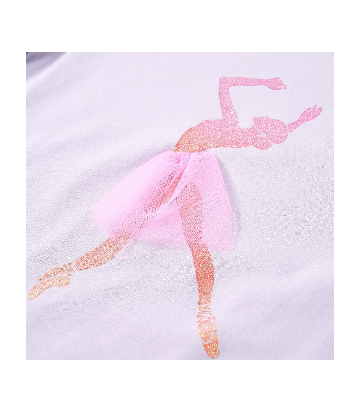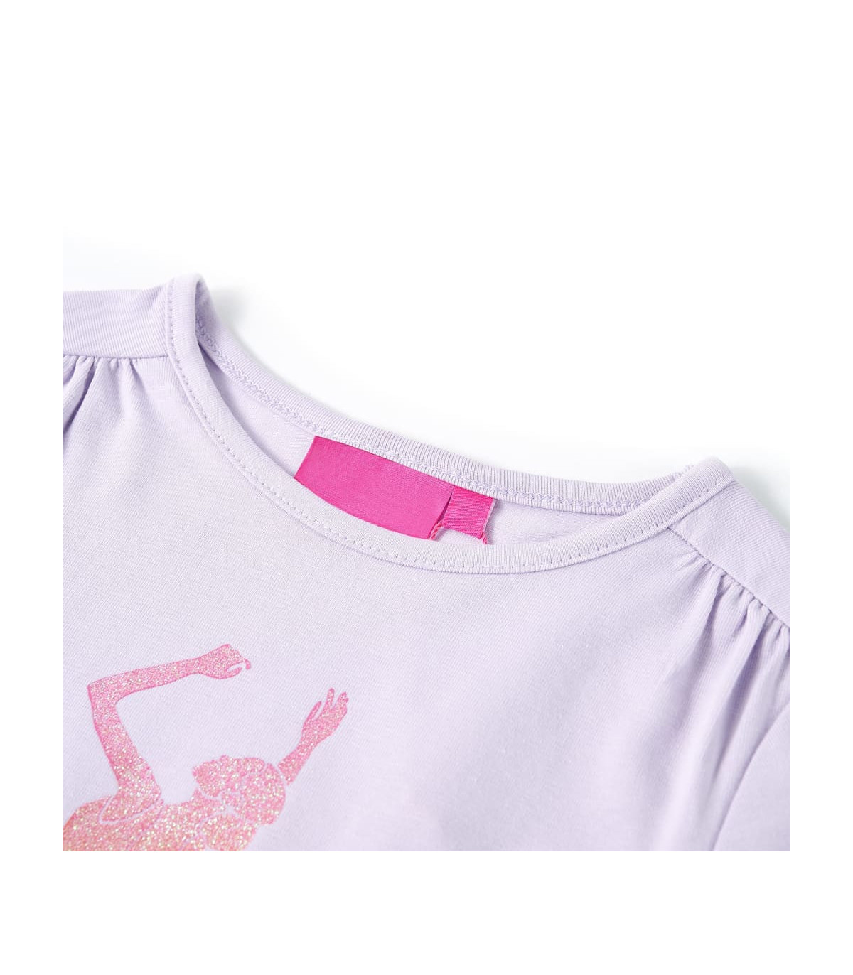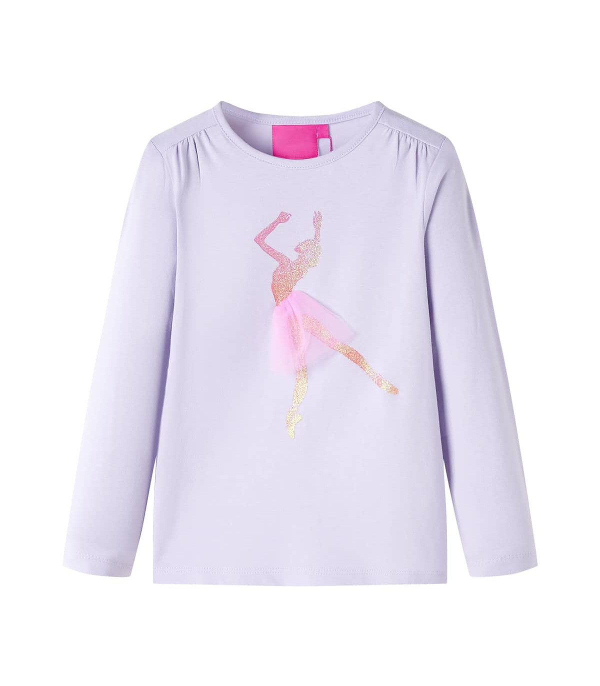 Our children's clothing line is all about affordable, high-quality, and durable everyday wear for kids aged 1.5 to 10. Our range includes jackets, sweaters, shirts, and many more, with a variety in style, size, and colour. Following the high-quality standard in the market, we are using high-grade materials and advanced manufacturing techniques. This kids' t-shirt has long sleeves, a round neckline, and a straight model. This light lilac t-shirt features a shiny ballerina girl with a tulle skirt print. The children's long sleeve t-shirt is made from soft material with 95% cotton and 5% elastane for extra comfort and breathability. Good to know: This size chart in the picture provides measurements for kids aged 1.5 to 10, covering the height, chest, waist, and hip. You can easily find the right fit for your child.