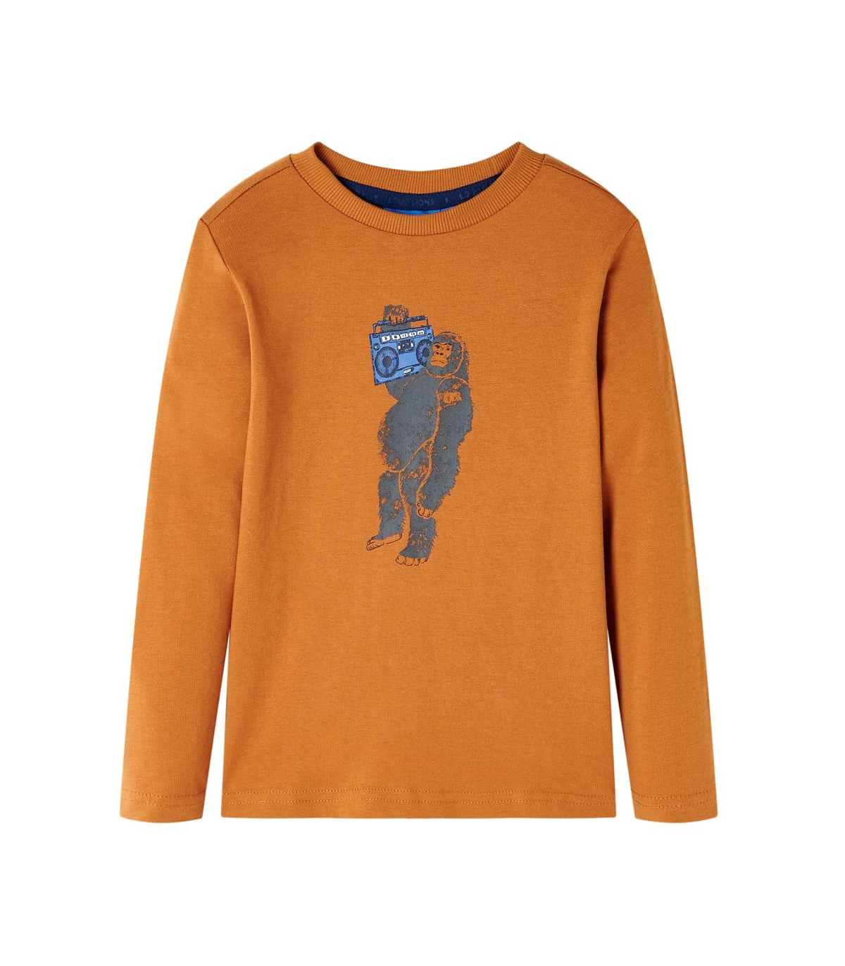 Our children's clothing line is all about affordable, high-quality, and durable everyday wear for kids aged 1.5 to 10. Our range includes jackets, sweaters, shirts, and many more, with a variety in style, size, and colour. Following the high-quality standard in the market, we are using high-grade materials and advanced manufacturing techniques. This kids' T-shirt has long sleeves, a round neckline, and a straight model. This dark ochre T-shirt features a big gorilla with a music player. The children's long sleeve T-shirt is made of 100% cotton for a soft and comfortable touch. Good to know: The size chart in the picture provides measurements for kids aged 1.5 to 10, covering the height, chest, waist, and hip. You can easily find the right fit for your child.