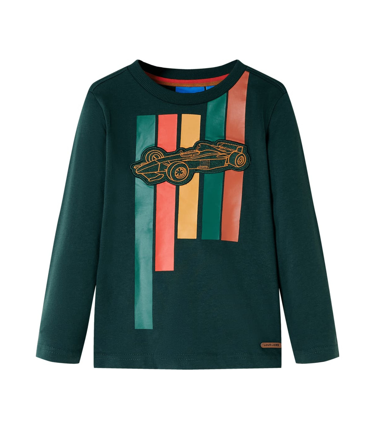 Our children's clothing line is all about affordable, high-quality, and durable everyday wear for kids aged 1.5 to 10. Our range includes jackets, sweaters, shirts, and many more, with a variety in style, size, and colour. Following the high-quality standard in the market, we are using high-grade materials and advanced manufacturing techniques. This kids' T-shirt has long sleeves, a round neckline, and a straight model. This dark green T-shirt features a racing car and colourful stripes. The children's long sleeve T-shirt is made of 100% cotton that is treated with a silicon and enzyme wash for a soft and comfortable touch. Good to know: The size chart in the picture provides measurements for kids aged 1.5 to 10, covering the height, chest, waist, and hip. You can easily find the right fit for your child.