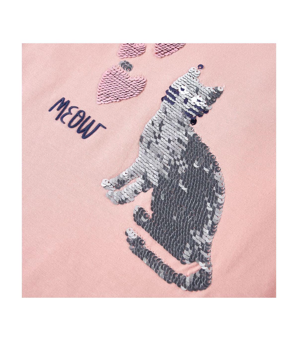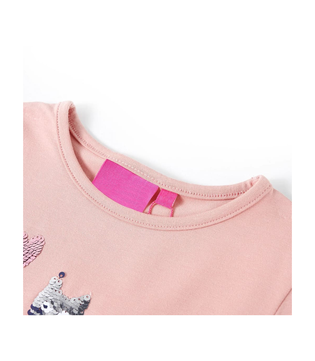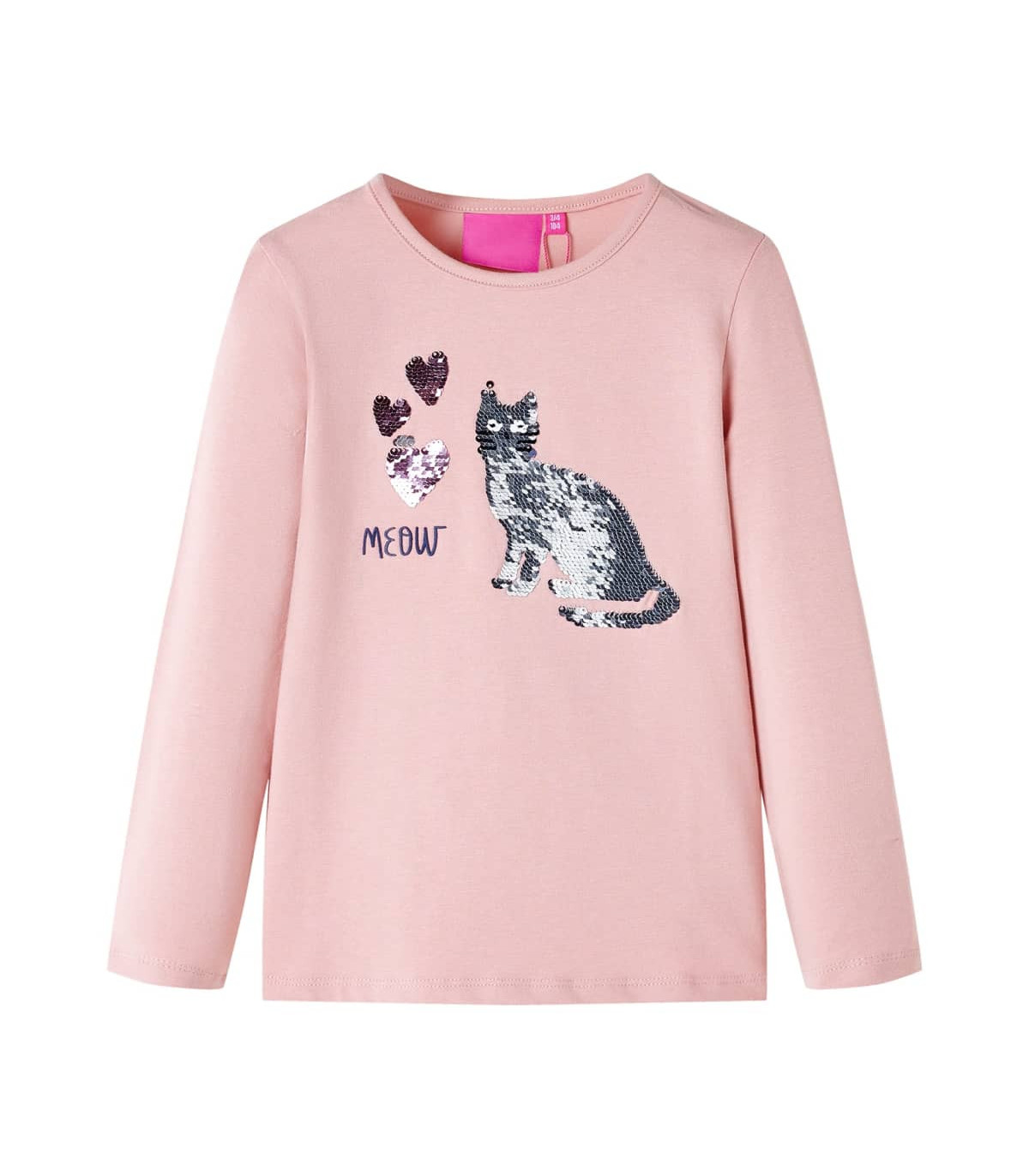 Our children's clothing line is all about affordable, high-quality, and durable everyday wear for kids aged 1,5 to 10. Our range includes jackets, sweaters, shirts, and many more, with a variety in style, size, and colour. Following the high-quality standard in the market, we are using high-grade materials and advanced manufacturing techniques. This kids' t-shirt has long sleeves, a round neckline, and a straight model. This light pink t-shirt features a sparkling sequin cat and is embellished with sequin hearts. The children's long sleeve t-shirt is made from soft material with 95% cotton and 5% elastane for extra comfort and breathability. Good to know: The size chart in the picture provides measurements for kids aged 1,5 to 10, covering the height, chest, waist, and hip. You can easily find the right fit for your child.