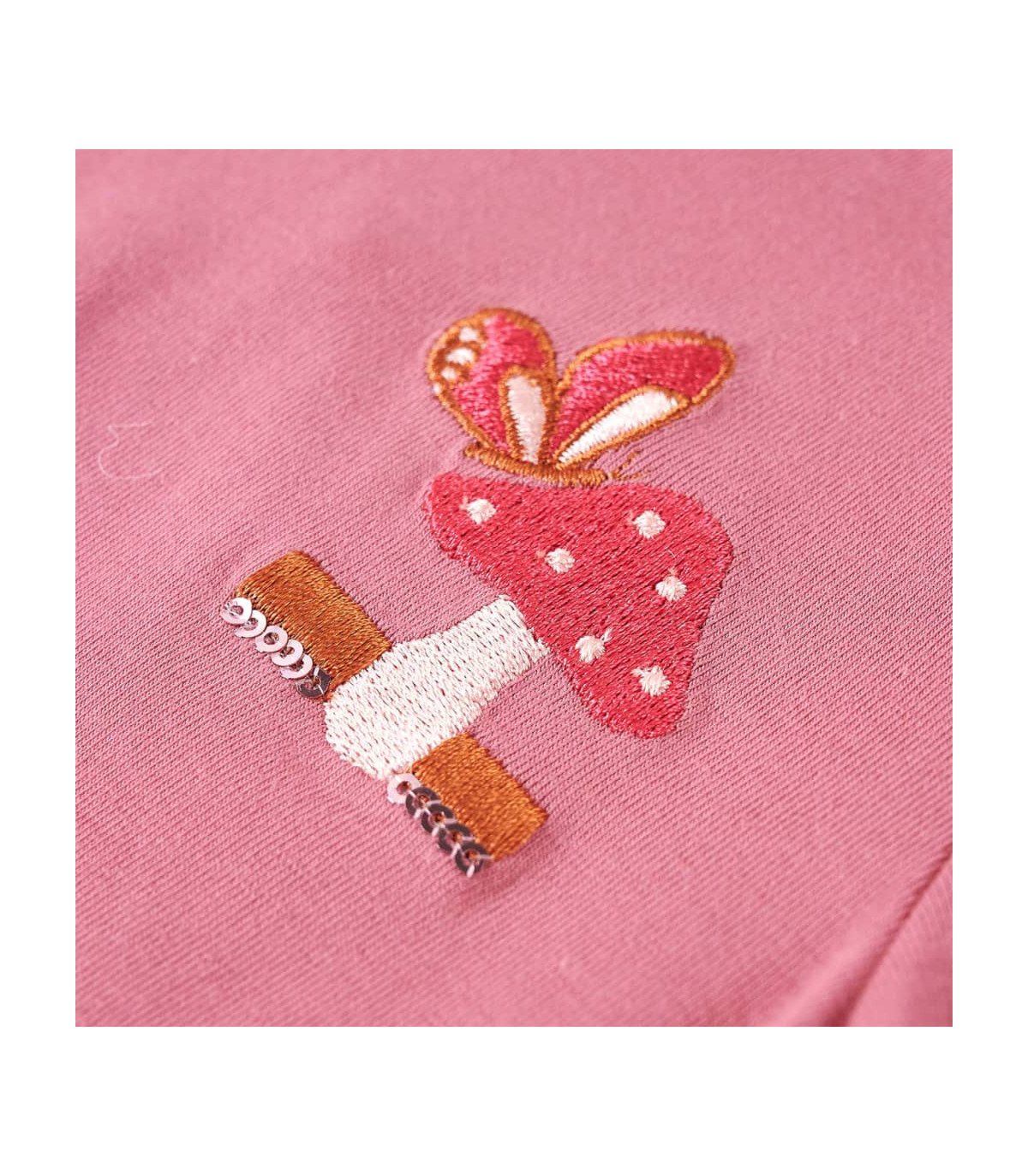 Our children's clothing line is all about affordable, high-quality, and durable everyday wear for kids aged 1.5 to 10. Our range includes jackets, sweaters, shirts, and many more, with a variety in style, size, and colour. Following the high-quality standard in the market, we are using high-grade materials and advanced manufacturing techniques. This kids' t-shirt has long sleeves, a round neckline, and a straight model. Ruffle with matching glitter piping. This navy blue t-shirt features a mushroom and a cute butterfly on the chest. The children's long sleeve t-shirt is made from soft material with 95% cotton and 5% elastane for extra comfort and breathability. Good to know: The size chart in the picture provides measurements for kids aged 1.5 to 10, covering the height, chest, waist, and hip. You can easily find the right fit for your child.