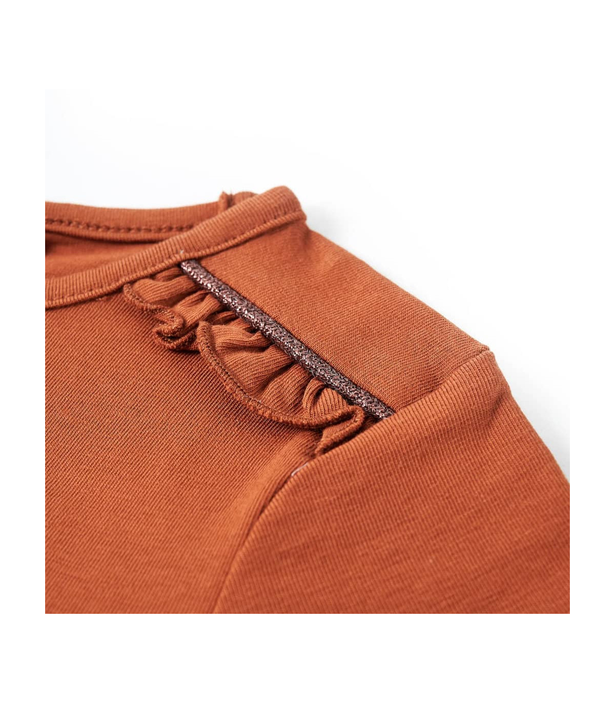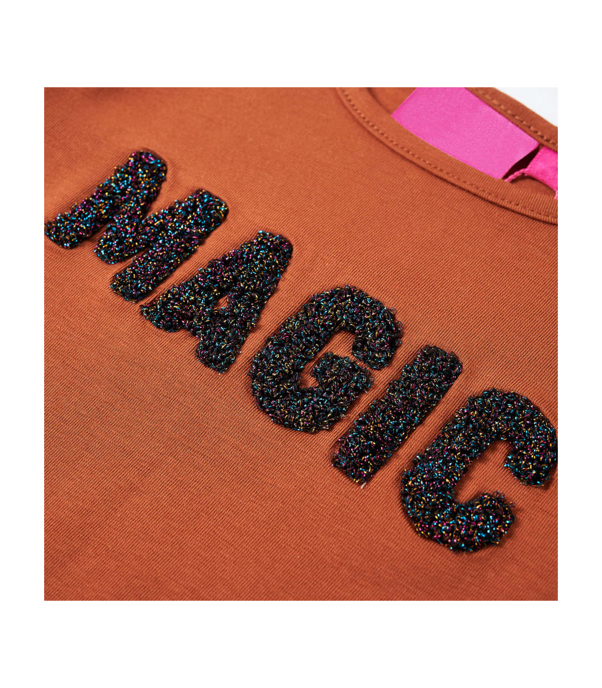 Our children's clothing line is all about affordable, high-quality, and durable everyday wear for kids aged 1.5 to 10. Our range includes jackets, sweaters, shirts, and many more, with a variety in style, size, and colour. Following the high-quality standard in the market, we are using high-grade materials and advanced manufacturing techniques. This kids' t-shirt has long sleeves, a round neckline, and a straight model. Ruffle with matching glitter piping. This cognac-coloured t-shirt features a multicolour glitter "MAGIC" pattern. The children's long sleeve t-shirt is made from soft material with 95% cotton and 5% elastane for extra comfort and breathability. Good to know: The size chart in the picture provides measurements for kids aged 1.5 to 10, covering the height, chest, waist, and hip. You can easily find the right fit for your child.