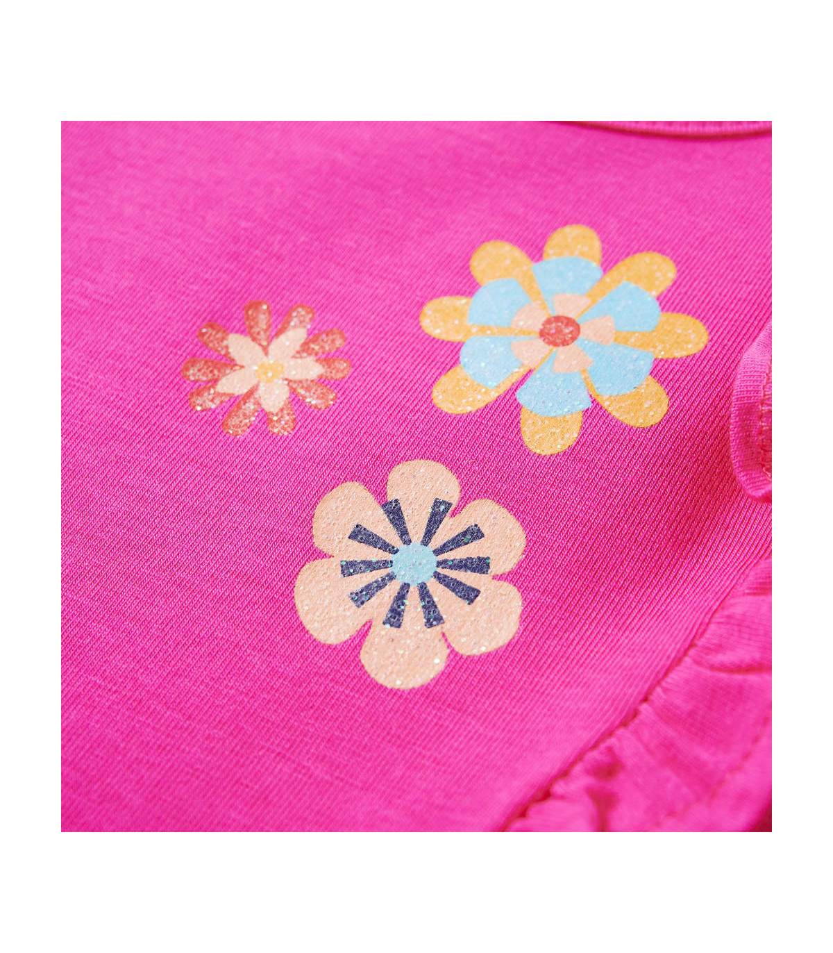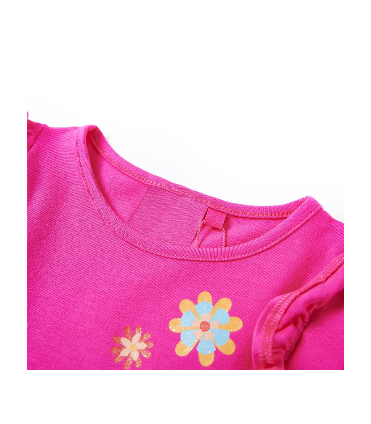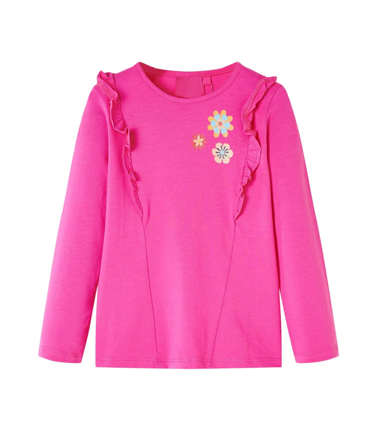 Our children's clothing line is all about affordable, high-quality, and durable everyday wear for kids aged 1.5 to 10. Our range includes jackets, sweaters, shirts, and many more, with a variety in style, size, and colour. Following the high-quality standard in the market, we are using high-grade materials and advanced manufacturing techniques. This kids' t-shirt has long sleeves, a round neckline, and a straight model. The children's t-shirt is printed with flowers and designed with nice ruffles. The children's long sleeve t-shirt is made from soft material with 95% cotton and 5% elastane for extra comfort and breathability. Good to know: The size chart in the picture provides measurements for kids aged 1.5 to 10, covering the height, chest, waist, and hip. You can easily find the right fit for your child.