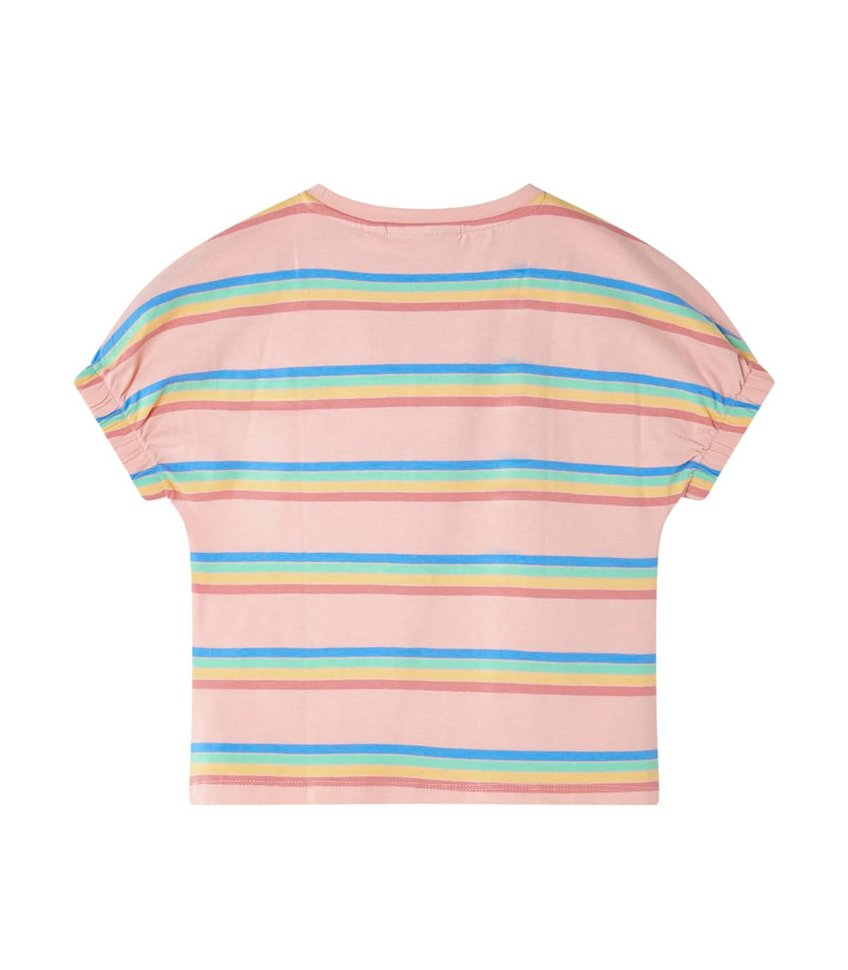 Our children’s clothing line is all about affordable, high-quality, and durable everyday wear for kids aged 1.5 to 10. Our range includes jackets, sweaters, shirts, and many more, with a variety in style, size, and colour. Following the high-quality standard in the market, we are using high-grade materials and advanced manufacturing techniques. This kids' T-shirt has short sleeves with elastic cuffs, a round neckline, and a straight model. This peach T-shirt features rainbow stripes. The children's short sleeve T-shirt is made of soft material with 95% cotton and 5% elastane for comfort and breathability. Good to know: The size chart in the picture provides measurements for kids aged 1.5 to 10, covering the height, chest, waist, and hip. You can easily find the right fit for your child.