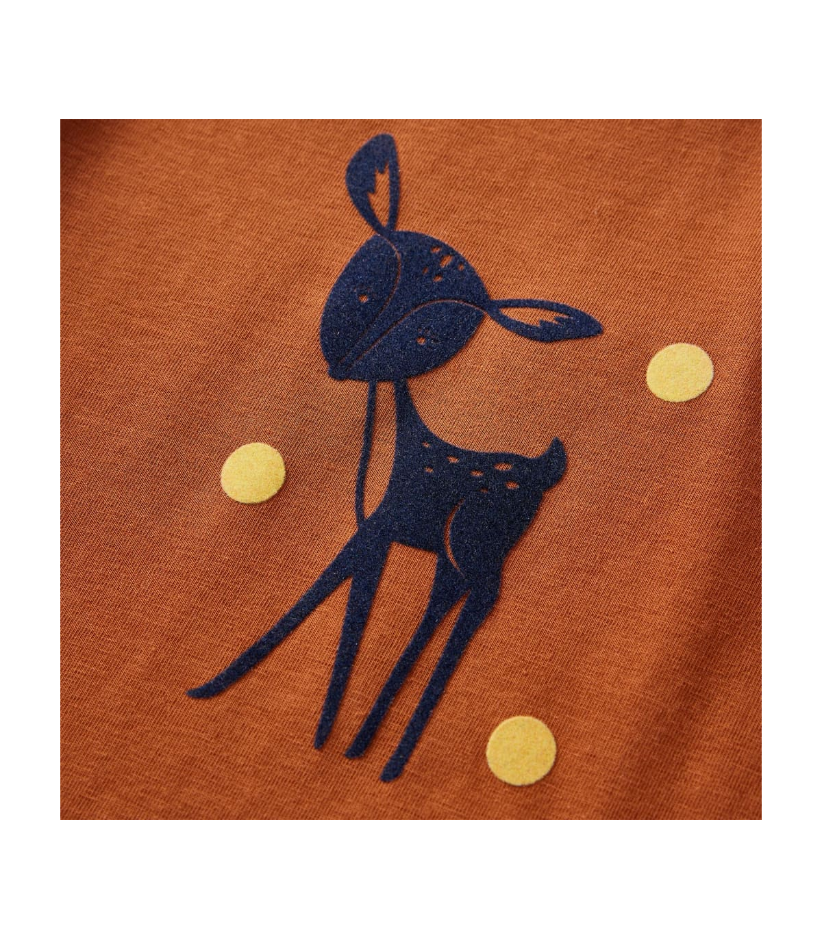 Our children’s clothing line is all about affordable, high-quality, and durable everyday wear for kids aged 1.5 to 10. Our range includes jackets, sweaters, shirts, and many more, with a variety in style, size, and colour. Following the high-quality standard in the market, we are using high-grade materials and advanced manufacturing techniques. This kids' t-shirt has long sleeves, a round neckline, and a straight model. The children's t-shirt features a cute, flocked deer. The children's long sleeve t-shirt is made from soft material with 95% cotton and 5% elastane for extra comfort and breathability. Good to know: The size chart in the picture provides measurements for kids aged 1.5 to 10, covering the height, chest, waist, and hip. You can easily find the right fit for your child.