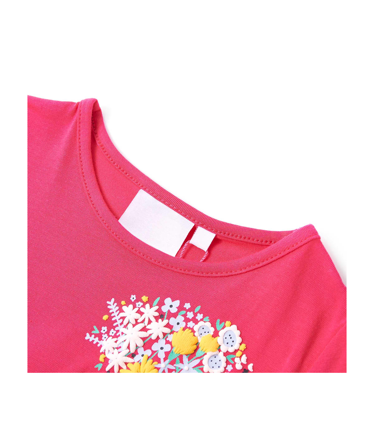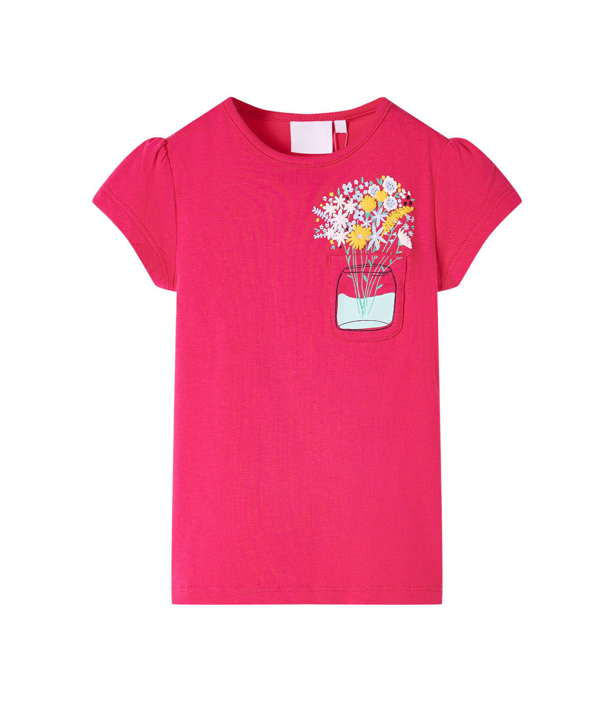 Our children's clothing line is all about affordable, high-quality, and durable everyday wear for kids aged 1.5 to 10. Our range includes jackets, sweaters, shirts, and many more, with a variety in style, size, and colour. Following the high-quality standard in the market, we are using high-grade materials and advanced manufacturing techniques. This kids' T-shirt has short sleeves, a round neckline, and a straight model. This bright pink T-shirt features a beautiful bunch of flowers and a patch pocket on the left chest. The children's short sleeve T-shirt is made of 95% cotton and 5% elastane for comfort and breathability. Good to know: The size chart in the picture provides measurements for kids aged 1.5 to 10, covering the height, chest, waist, and hip. You can easily find the right fit for your child.