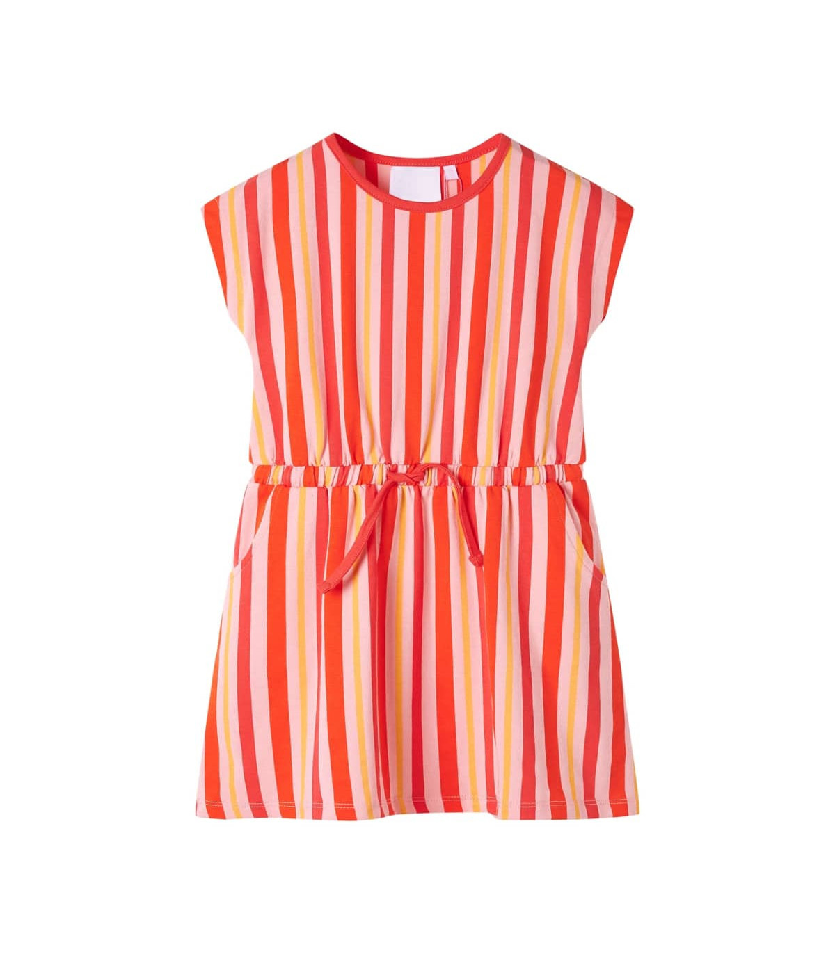 Our children's clothing line is all about affordable, high-quality, and durable everyday wear for kids aged 1,5 to 10. Our range includes jackets, sweaters, shirts, and many more, with a variety in style, size, and colour. Following the high-quality standard in the market, we are using high-grade materials and advanced manufacturing techniques. This kids' dress has a round neckline, short sleeves and a drawstring waistband. This children's dress is printed with vibrant vertical stripes all over. The kids' short dress is made from soft material that includes 95% cotton and 5% elastane for comfort and breathability. Good to know: The size chart in the picture provides measurements for kids aged 1,5 to 10, covering the height, chest, waist, and hip. You can easily find the right fit for your child.