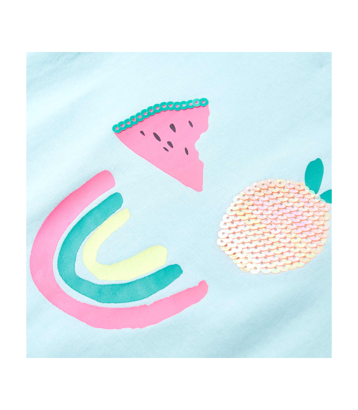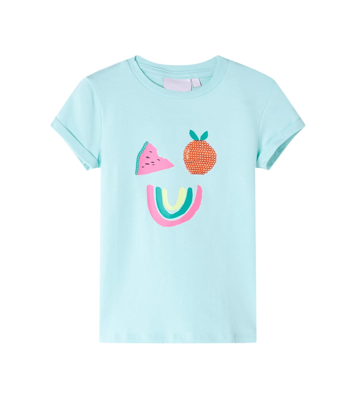 Our children's clothing line is all about affordable, high-quality, and durable everyday wear for kids aged 1,5 to 10. Our range includes jackets, sweaters, shirts, and many more, with a variety in style, size, and colour. Following the high-quality standard in the market, we are using high-grade materials and advanced manufacturing techniques. This kids' T-shirt has roll-up short sleeves, a round neckline, and a straight model. The kids' top has a colourful watermelon and a sequined apple, adding extra beauty and fun. The children's short sleeve T-shirt is made from soft material with 95% cotton and 5% elastane, providing extra comfort and stretch. Good to know: The size chart in the picture provides measurements for kids aged 1,5 to 10, covering the height, chest, waist, and hip. You can easily find the right fit for your child.