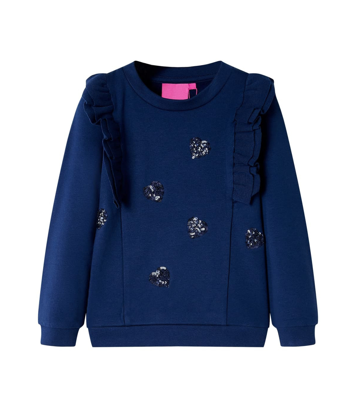 Our children’s clothing line is all about affordable, high-quality, and durable everyday wear for kids aged 1,5 to 10. Our range includes jackets, sweaters, shirts, and many more, with a variety in style, size, and colour. Following the high-quality standard in the market, we are using high-grade materials and advanced manufacturing techniques. This kids' sweatshirt has long sleeves, a round neck, and rib-knit edges at the cuffs, neckline, and bottom. The sweatshirt for kids features shiny hearts and nice ruffles. The kids' top is made of cotton and elastane for comfort and breathability. Good to know: This size chart in the picture provides measurements for kids aged 1,5 to 10, covering the height, chest, waist, and hip. You can easily find the right fit for your child.