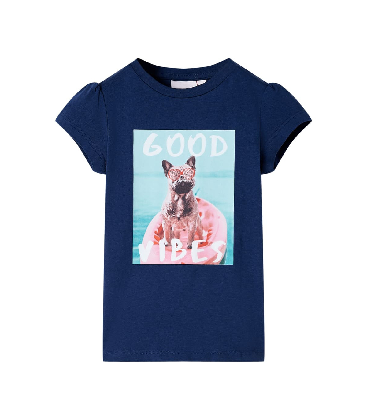 Our children's clothing line is all about affordable, high-quality, and durable everyday wear for kids aged 1,5 to 10. Our range includes jackets, sweaters, shirts, and many more, with a variety in style, size, and colour. Following the high-quality standard in the market, we are using high-grade materials and advanced manufacturing techniques. This kids' T-shirt has short sleeves, a round neckline, and a straight model. This blue T-shirt features a large brown dog with pink glittering heart glasses in a red boat. The children's short sleeve T-shirt is made from soft material with 95% cotton and 5% elastane, providing extra comfort and stretch. Good to know: The size chart in the picture provides measurements for kids aged 1,5 to 10, covering the height, chest, waist, and hip. You can easily find the right fit for your child.