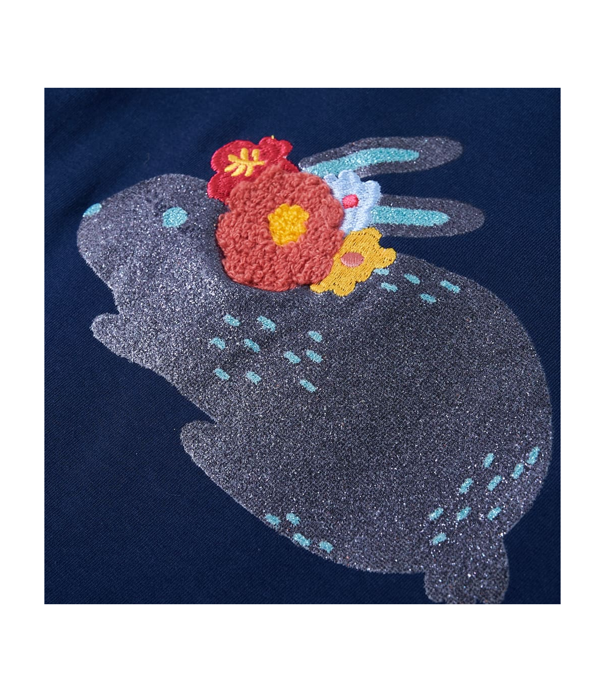Our children's clothing line is all about affordable, high-quality, and durable everyday wear for kids aged 1,5 to 10. Our range includes jackets, sweaters, shirts, and many more, with a variety in style, size, and colour. Following the high-quality standard in the market, we are using high-grade materials and advanced manufacturing techniques. This kids' t-shirt has long sleeves, a round neckline, and a straight model. This t-shirt features a large, lovely glittering rabbit with embroidery flowers on its head. The children's long sleeve t-shirt is made from soft material with 95% cotton and 5% elastane for extra comfort and breathability. Good to know: The size chart in the picture provides measurements for kids aged 1,5 to 10, covering the height, chest, waist, and hip. You can easily find the right fit for your child.