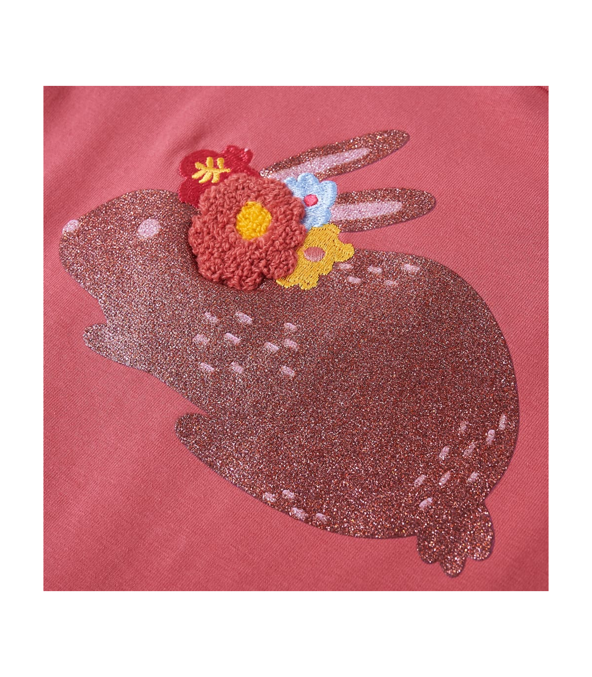 Our children's clothing line is all about affordable, high-quality, and durable everyday wear for kids aged 1,5 to 10. Our range includes jackets, sweaters, shirts, and many more, with a variety in style, size, and colour. Following the high-quality standard in the market, we are using high-grade materials and advanced manufacturing techniques. This kids' t-shirt has long sleeves, a round neckline, and a straight model. This t-shirt features a large, lovely glittering rabbit with embroidery flowers on its head. The children's long sleeve t-shirt is made from soft material with 95% cotton and 5% elastane for extra comfort and breathability. Good to know: The size chart in the picture provides measurements for kids aged 1,5 to 10, covering the height, chest, waist, and hip. You can easily find the right fit for your child.