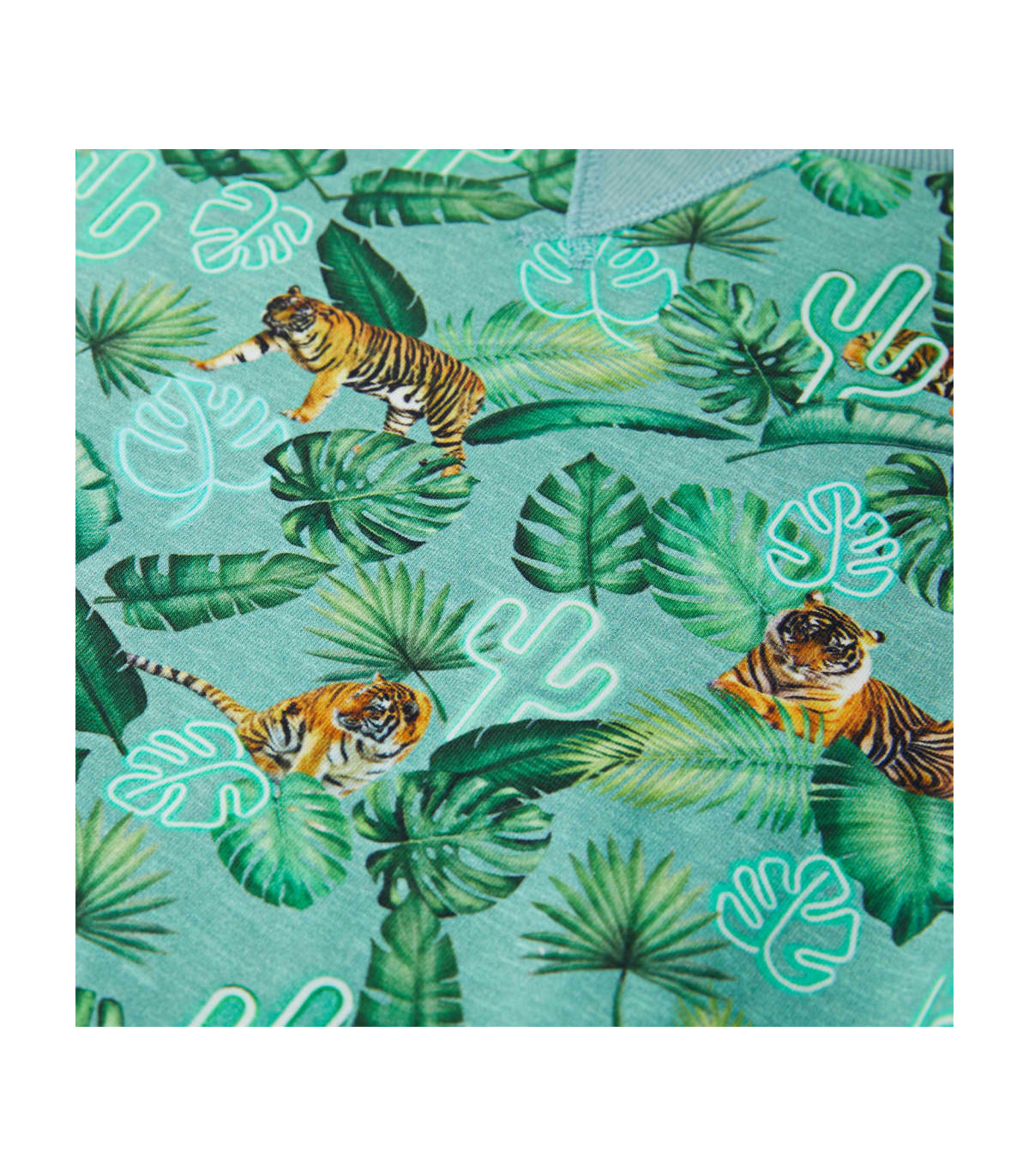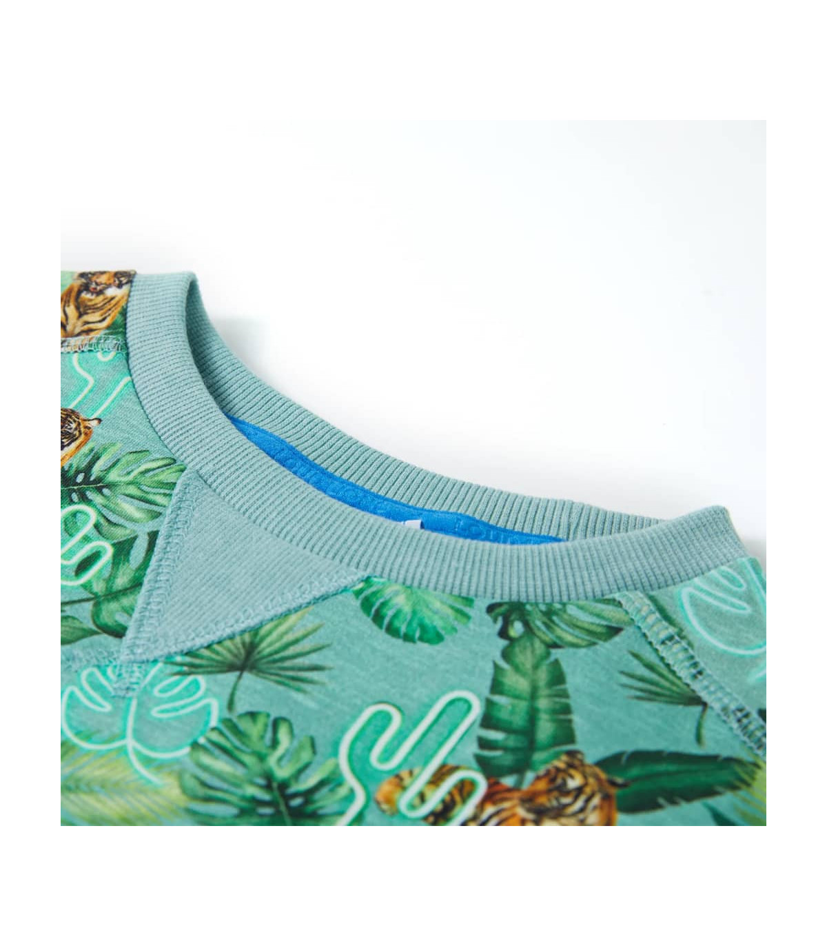 Our children's clothing line is all about affordable, high-quality, and durable everyday wear for kids aged 1.5 to 10. Our range includes jackets, sweaters, shirts, and many more, with a variety in style, size, and colour. Following the high-quality standard in the market, we are using high-grade materials and advanced manufacturing techniques. This kids' sweatshirt has long sleeves, a round neck, and rib-knit edges at the cuffs, neckline, and bottom. The children's sweatshirt is printed with plants and tigers all over. The kids' top is made of 95% cotton, and 5% elastane for comfort and breathability. Good to know: The size chart in the picture provides measurements for kids aged 1.5 to 10, covering the height, chest, waist, and hip. You can easily find the right fit for your child.
