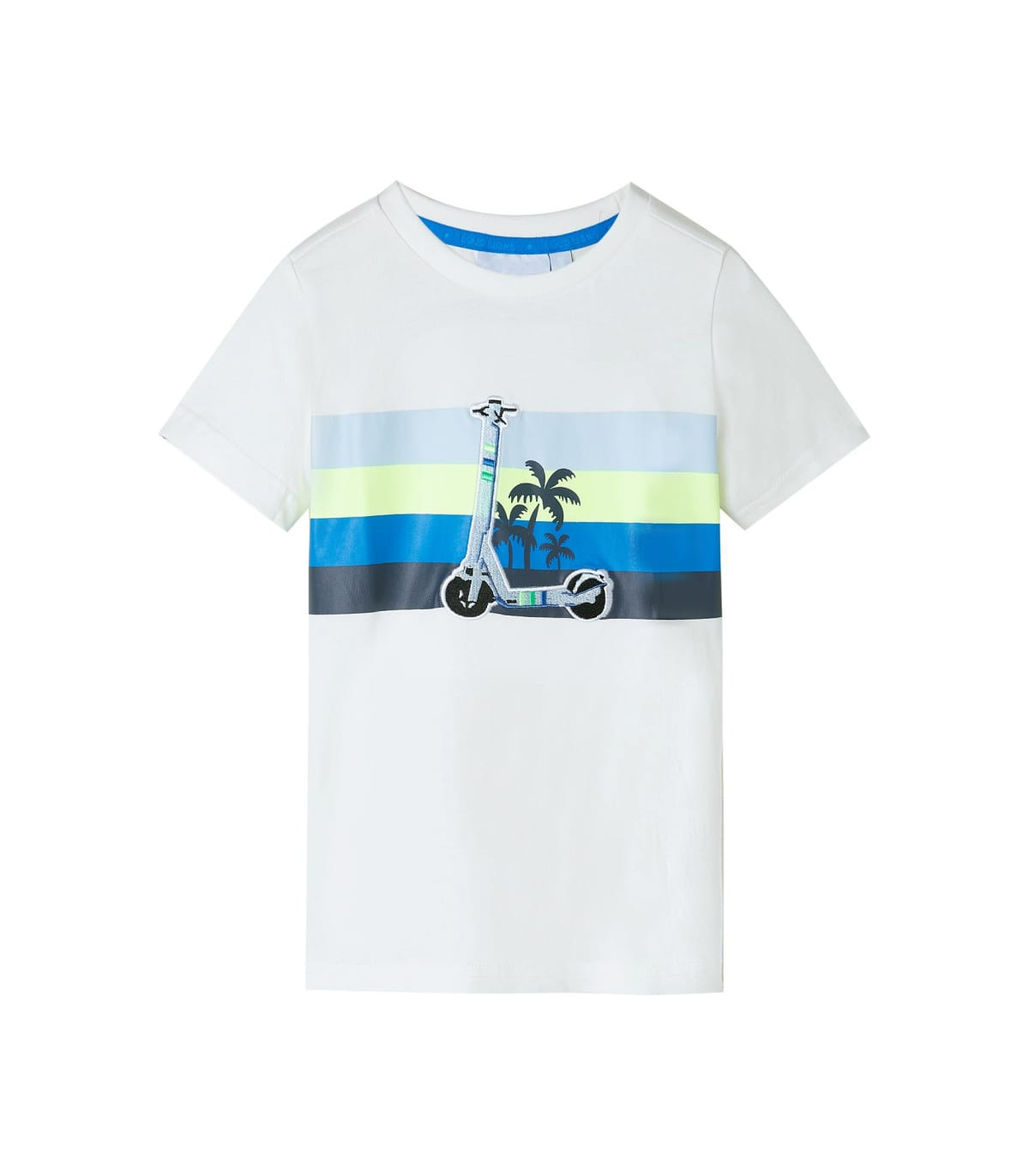 Our children's clothing line is all about affordable, high-quality, and durable everyday wear for kids aged 1.5 to 10. Our range includes jackets, sweaters, shirts, and many more, with a variety in style, size, and colour. Following the high-quality standard in the market, we are using high-grade materials and advanced manufacturing techniques. This kids' T-shirt has short sleeves, a round neckline, and a straight model. The children's T-shirt features an embroidered scooter with coloured stripes and coconut trees printed across the chest. The kids' short sleeved T-shirt is made of 100% cotton for a soft and comfortable touch. Good to know: The size chart in the picture provides measurements for kids aged 1.5 to 10, covering the height, chest, waist, and hip. You can easily find the right fit for your child.