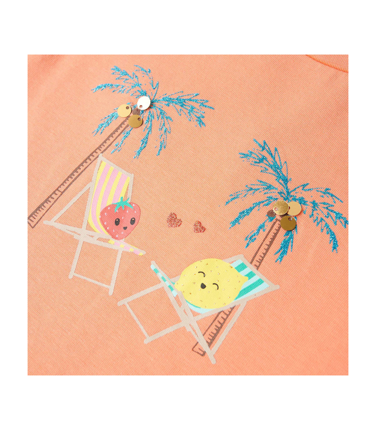 Our children's clothing line is all about affordable, high-quality, and durable everyday wear for kids aged 1.5 to 10. Our range includes jackets, sweaters, shirts, and many more, with a variety in style, size, and colour. Following the high-quality standard in the market, we are using high-grade materials and advanced manufacturing techniques. This kids' T-shirt has short sleeves, a round neckline, and a straight model. This soft pink T-shirt features 2 cute fruit cartoon characters who are lounging on the beach chairs under the coconut trees. The children's short sleeve T-shirt is made from soft material with 95% cotton and 5% elastane for comfort and breathability. Good to know: The size chart in the picture provides measurements for kids aged 1.5 to 10, covering the height, chest, waist, and hip. You can easily find the right fit for your child.