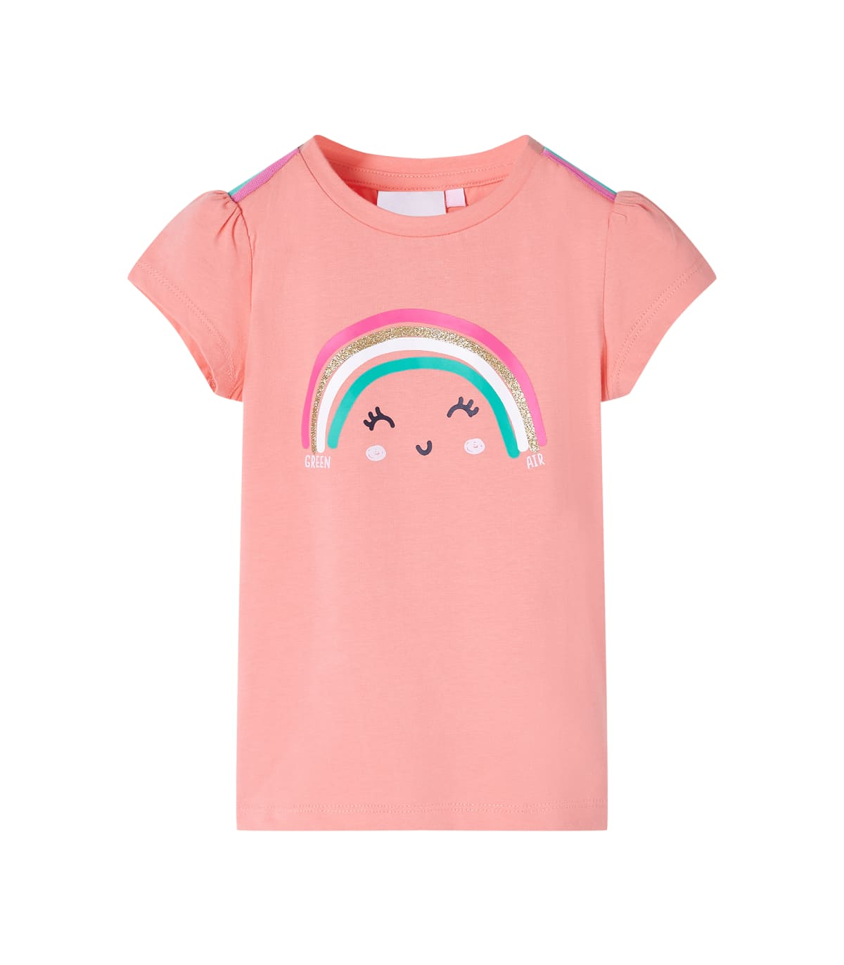 Our children's clothing line is all about affordable, high-quality, and durable everyday wear for kids aged 1,5 to 10. Our range includes jackets, sweaters, shirts, and many more, with a variety in style, size, and colour. Following the high-quality standard in the market, we are using high-grade materials and advanced manufacturing techniques. This kids' T-shirt has short sleeves, a round neckline, and a straight model. This T-shirt features a lovely smiling rainbow cartoon print on the chest. The children's short sleeve T-shirt is made of 95% cotton and 5% elastane for comfort and breathability. Good to know: The size chart in the picture provides measurements for kids aged 1,5 to 10, covering the height, chest, waist, and hip. You can easily find the right fit for your child.
