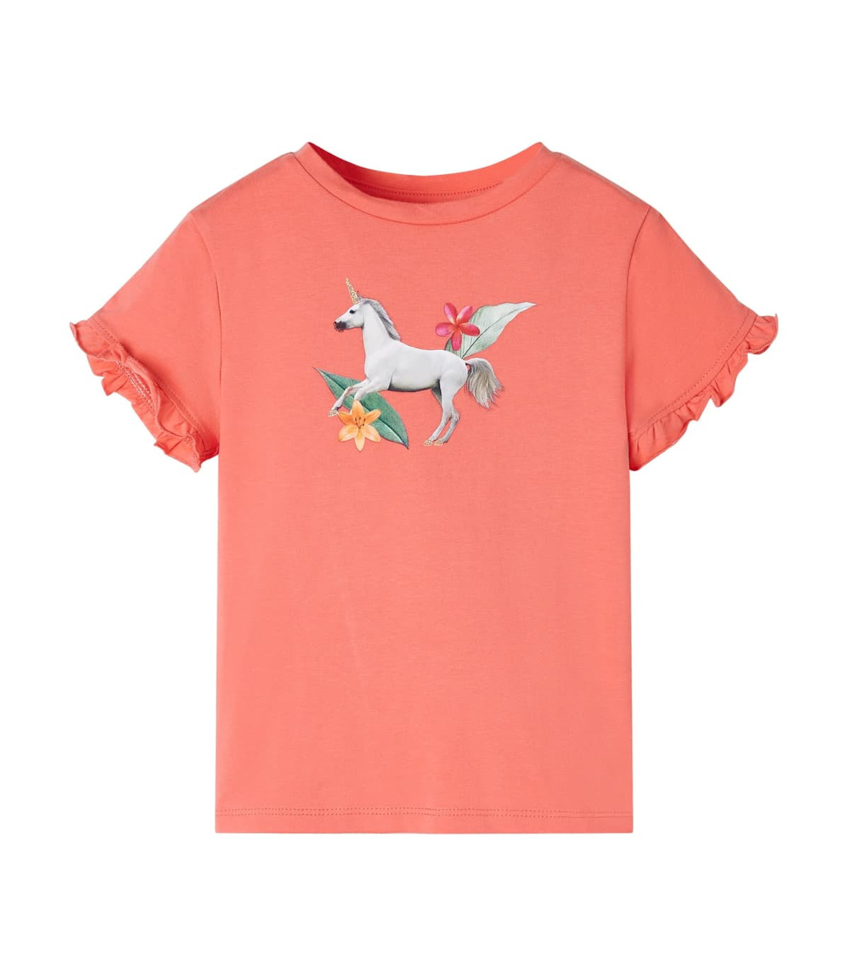 Our children’s clothing line is all about affordable, high-quality, and durable everyday wear for kids aged 1.5 to 10. Our range includes jackets, sweaters, shirts, and many more, with a variety in style, size, and colour. Following the high-quality standard in the market, we are using high-grade materials and advanced manufacturing techniques. This kids' T-shirt has short sleeves with ruffles, a round neckline, and a straight model. This children's T-shirt features a beautiful unicorn with leaves and flowers. The children's short sleeve T-shirt is made from soft material that includes 95% cotton and 5% elastane for comfort and breathability. Good to know: The size chart in the picture provides measurements for kids aged 1.5 to 10, covering the height, chest, waist, and hip. You can easily find the right fit for your child.