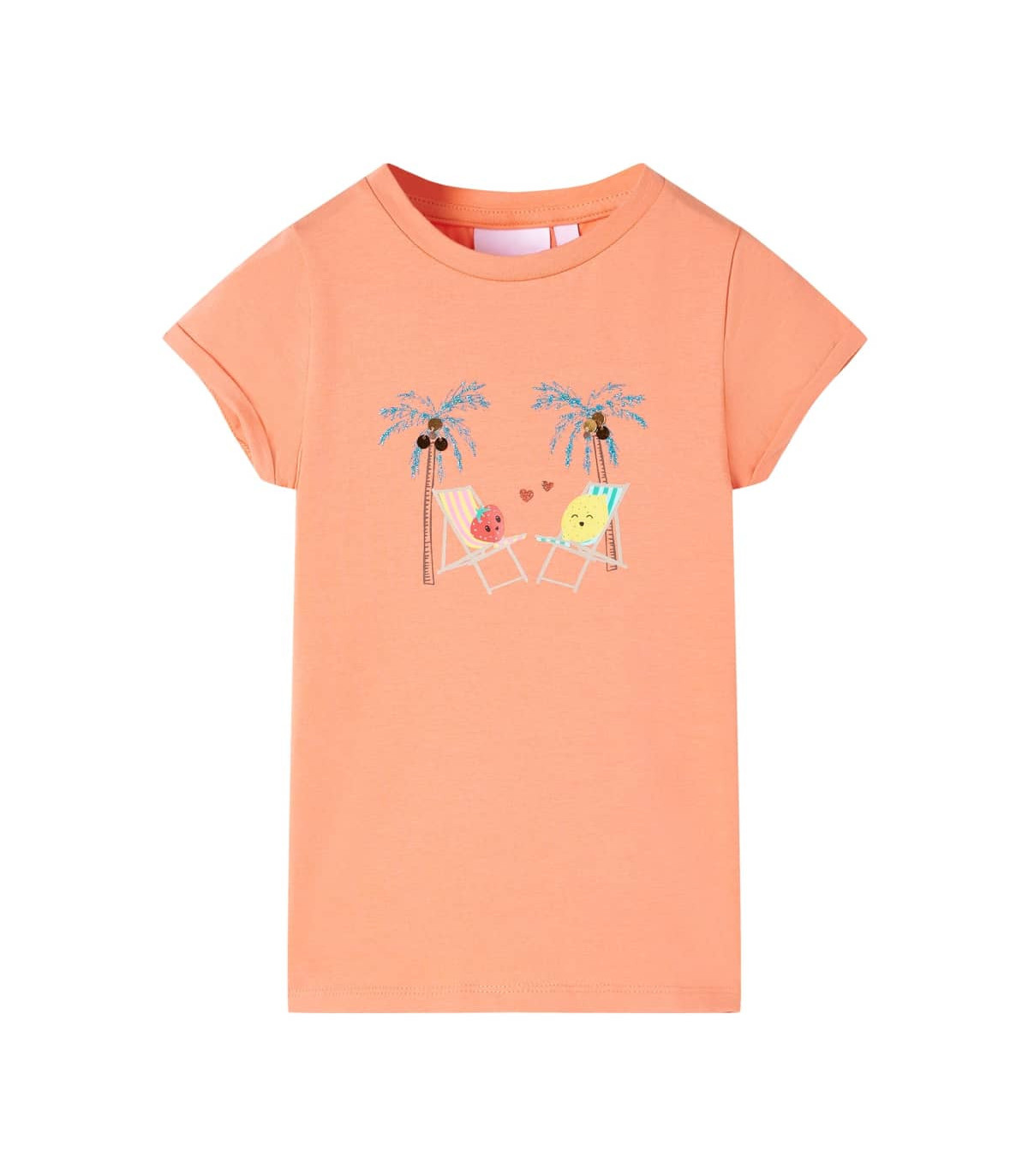 Our children's clothing line is all about affordable, high-quality, and durable everyday wear for kids aged 1.5 to 10. Our range includes jackets, sweaters, shirts, and many more, with a variety in style, size, and colour. Following the high-quality standard in the market, we are using high-grade materials and advanced manufacturing techniques. This kids' T-shirt has short sleeves, a round neckline, and a straight model. This soft pink T-shirt features 2 cute fruit cartoon characters who are lounging on the beach chairs under the coconut trees. The children's short sleeve T-shirt is made from soft material with 95% cotton and 5% elastane for comfort and breathability. Good to know: The size chart in the picture provides measurements for kids aged 1.5 to 10, covering the height, chest, waist, and hip. You can easily find the right fit for your child.