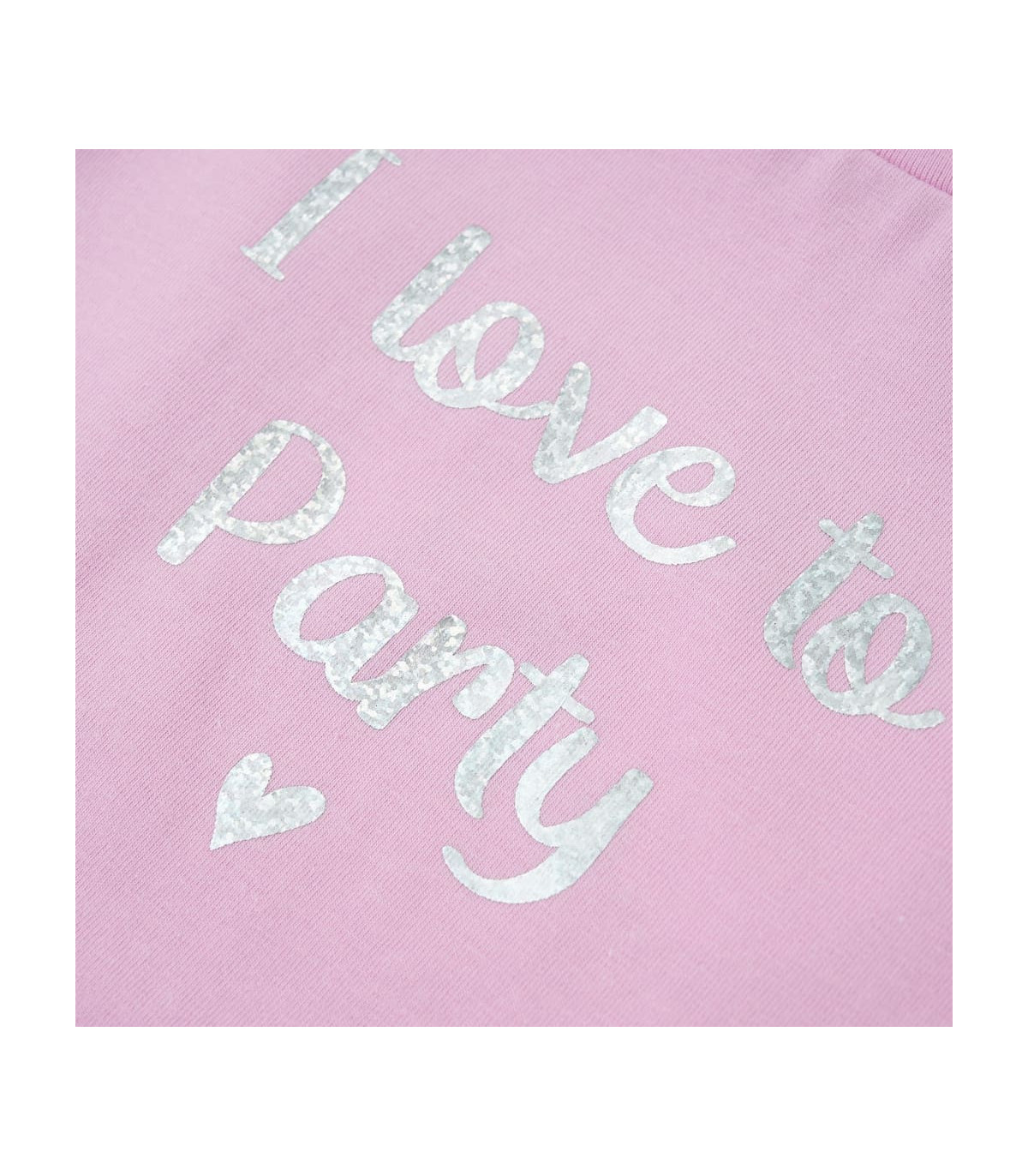 Our children’s clothing line is all about affordable, high-quality, and durable everyday wear for kids aged 1.5 to 10. Our range includes jackets, sweaters, shirts, and many more, with a variety in style, size, and colour. Following the high-quality standard in the market, we are using high-grade materials and advanced manufacturing techniques. This kids' T-shirt has ruffle sleeves, a round neckline, and a straight model. The glitter print makes the children's T-shirt look elegant and beautiful. The children's short sleeve T-shirt is made of 95% cotton and 5% elastane for a soft and comfortable touch. Good to know: The size chart in the picture provides measurements for kids aged 1.5 to 10, covering the height, chest, waist, and hip. You can easily find the right fit for your child.